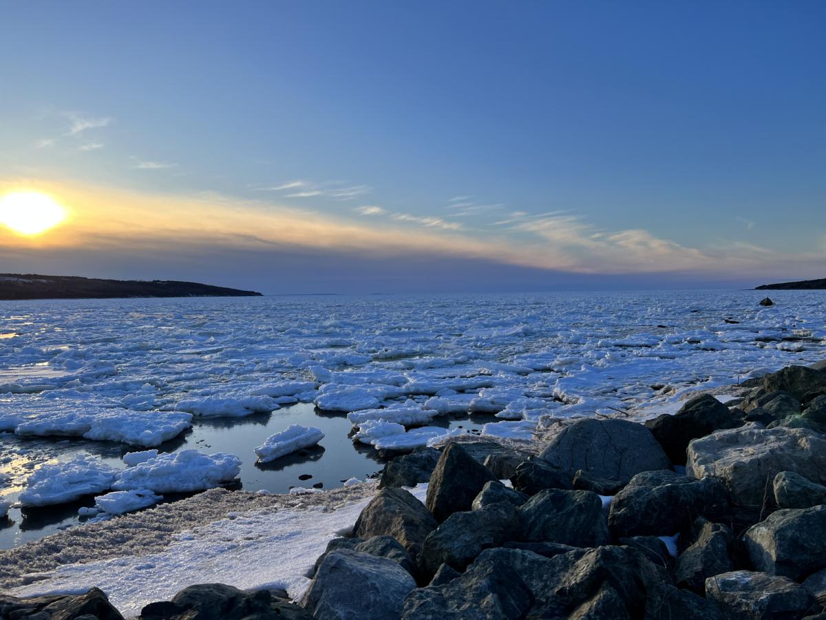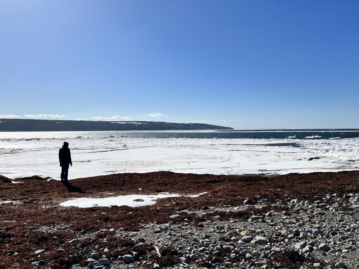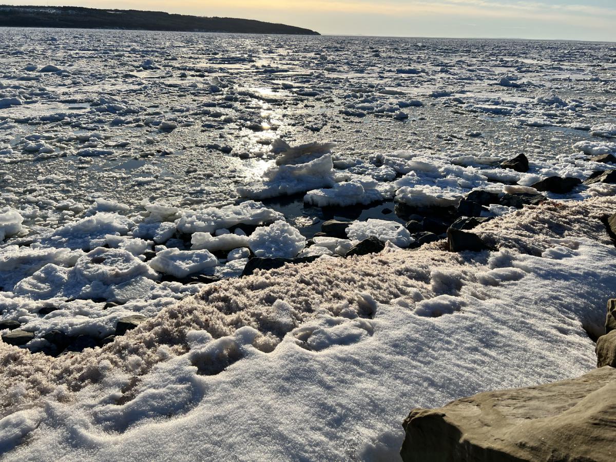 Der nächste Regentag wird ein Ruhetag - wir waren immer noch nicht ganz fit und ein paar Kleinigkeiten wurden umgeräumt. Der Tag darauf empfängt uns mit Schneeregen, Wind und Nebel - eigentlich wollten wir uns noch den Tidenhub der Bay of Fundy ansehen, der der höchste der Welt ist, aber bei diesem Wetter wir zogen weiter Richtung Norden bis zum Beginn des Cape Breton. Am Nachmittag kamen wir am Ufer des Fjordes neben dem Celtic Trail an. Fasziniert von den Eisschollen liefen wir dort entlang. Danach beobachten wir das Treiben des Eis bei einem Tee noch vom Auto aus. Am nächsten Morgen hatte der Wind Packeis in die Bucht getrieben - alles war weiß.
