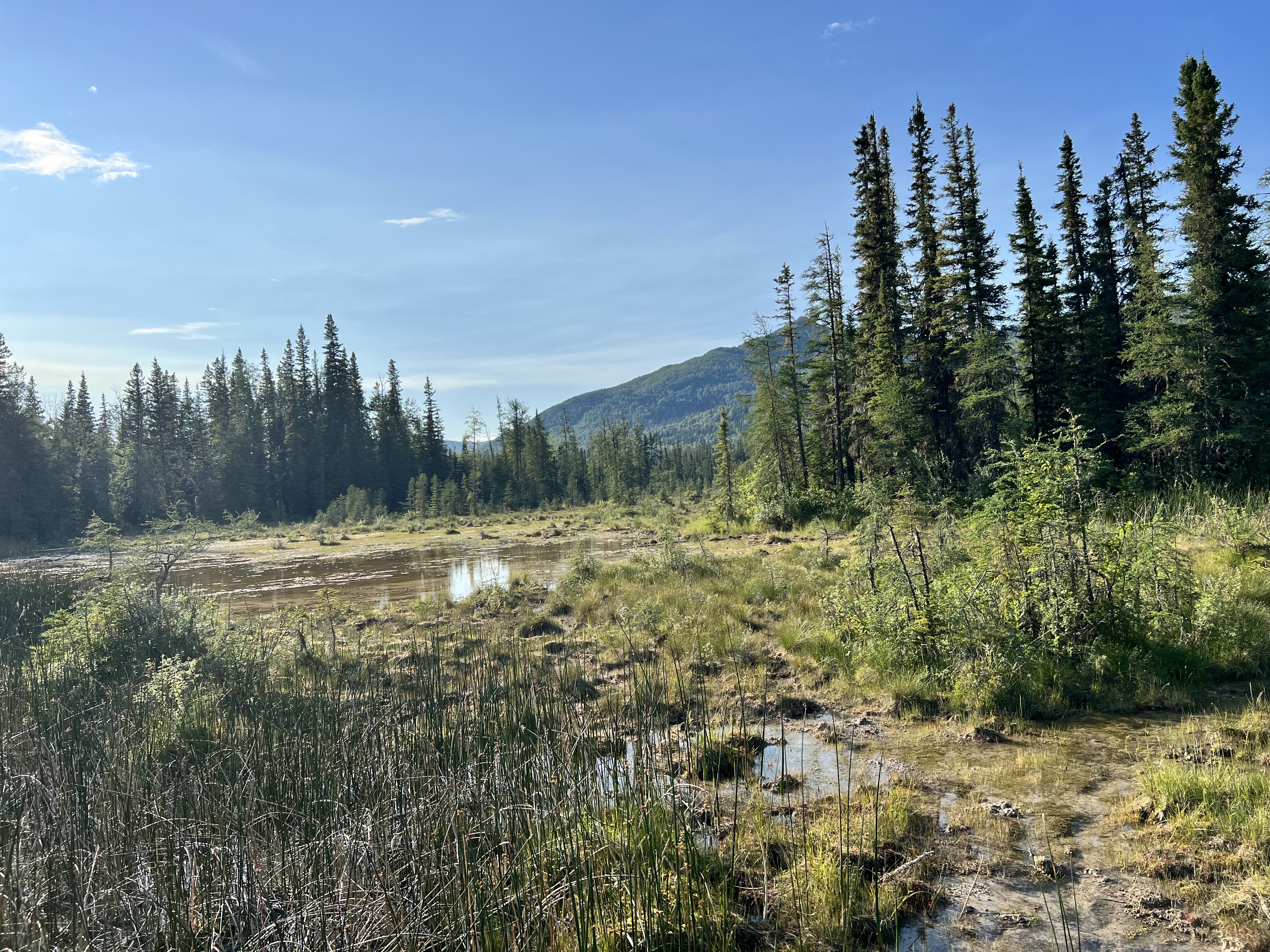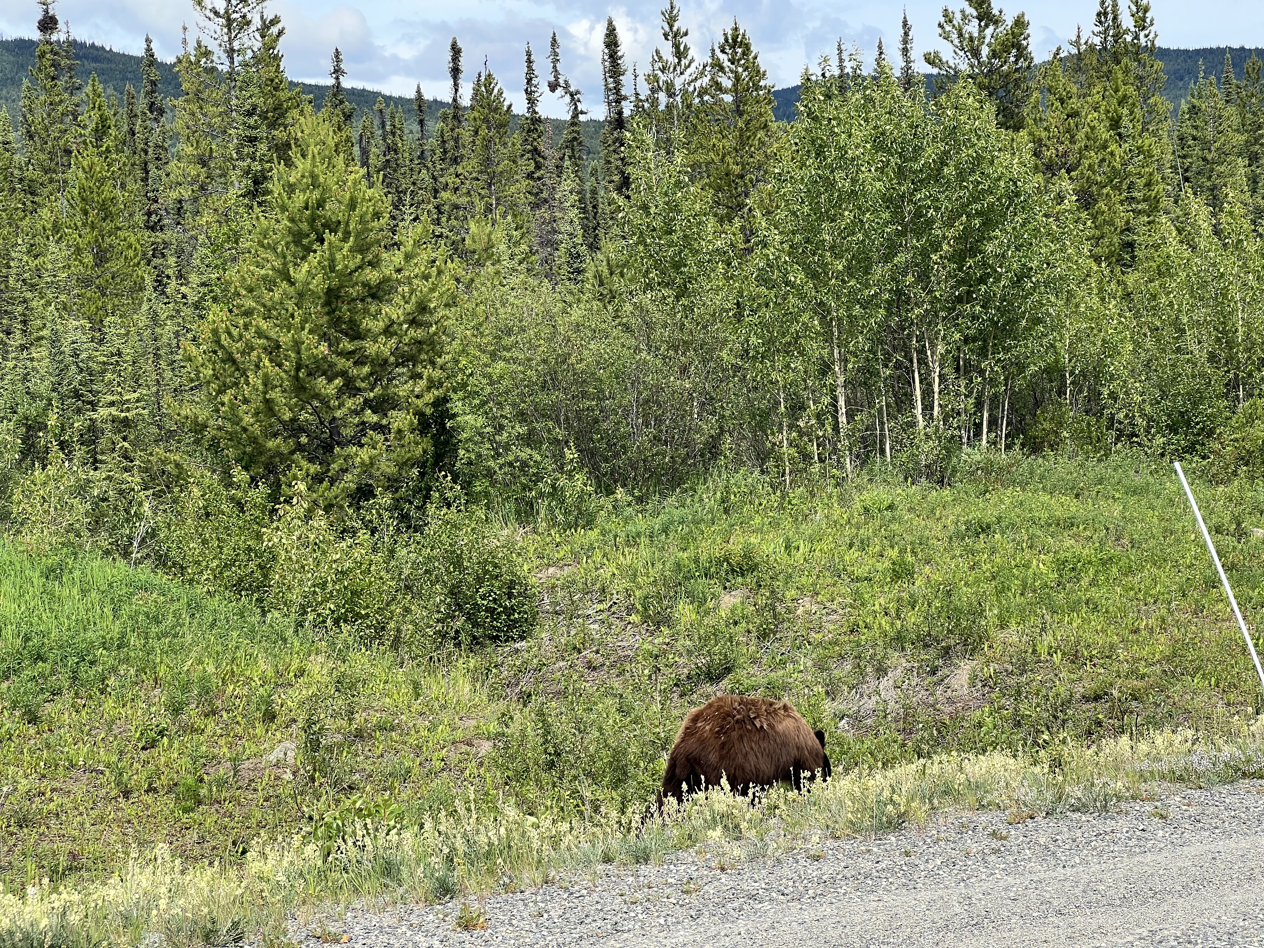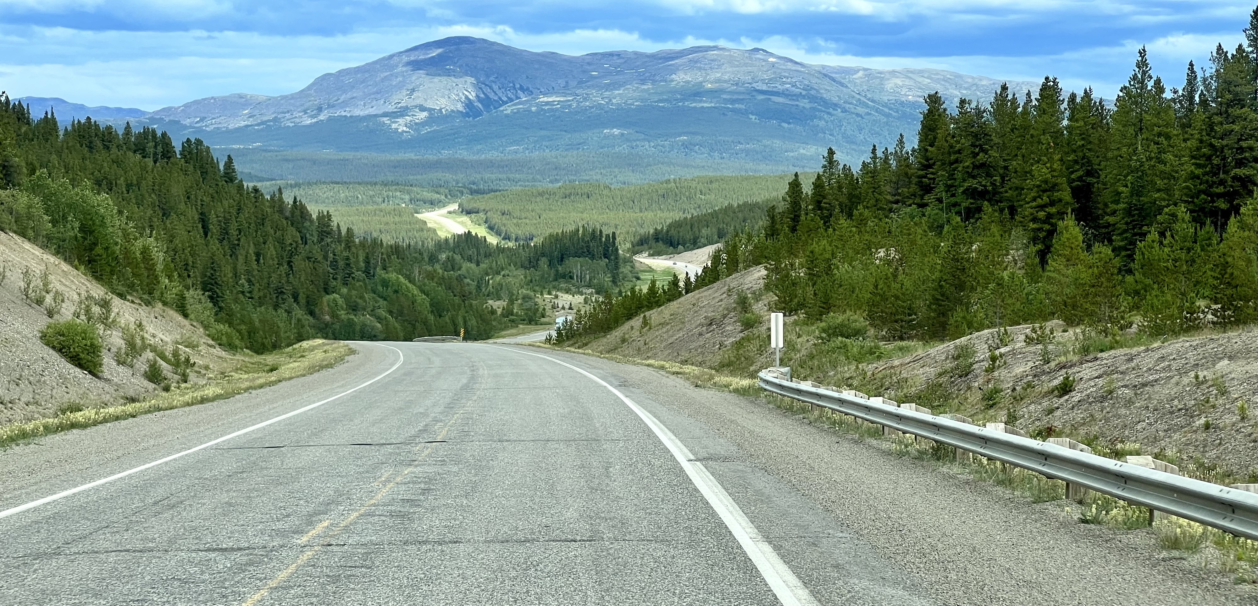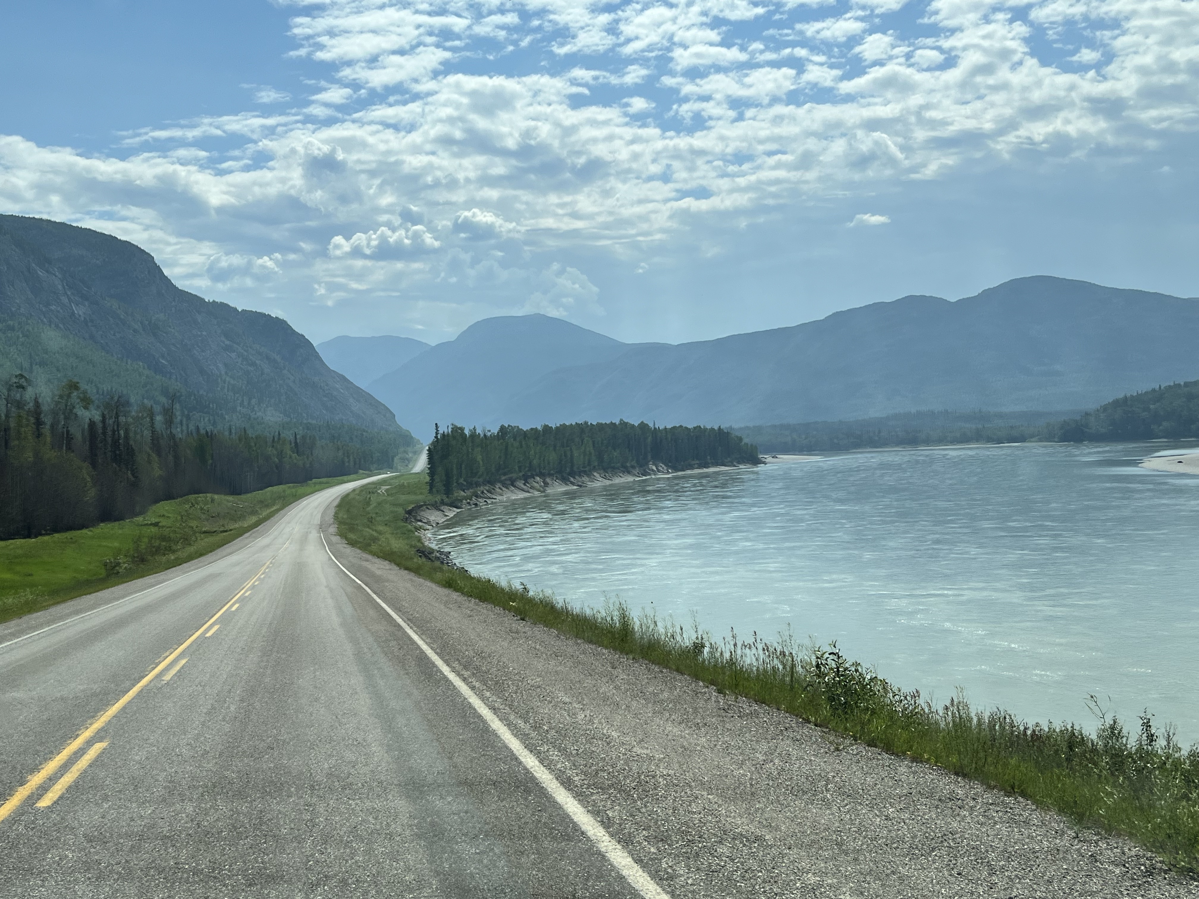 Nach Whitehorse geht es über den Alaska Highway wieder in Richtung Süden. Der Alaska Highway wurde zum Ende des zweiten Weltkriegs in nur 9 Monaten erbaut, um die Möglichkeit zu haben, schnell Truppen in den Norden zu verlegen. Die damalige Strasse war einspurig und für Militärfahrzeuge geeignet und entschieden weniger ausgebaut als die jetzige asphatierte Strasse. Der Alaska Highway beginnt in Dawson Creek und endet in Delta Junction. Wir fahren ihn von Tok bis Dawson Creek zurück. Ab Whitehorse ist die Strasse gut zu fahren; davor ist sie oft wellig und hat viele Schlaglöcher. Man merkt den Klimawandel: Der Permafrostboden taut auf und senkt den Boden - die Instandhaltung der Strasse ist hier ein Kampf gegen Windmühlen.