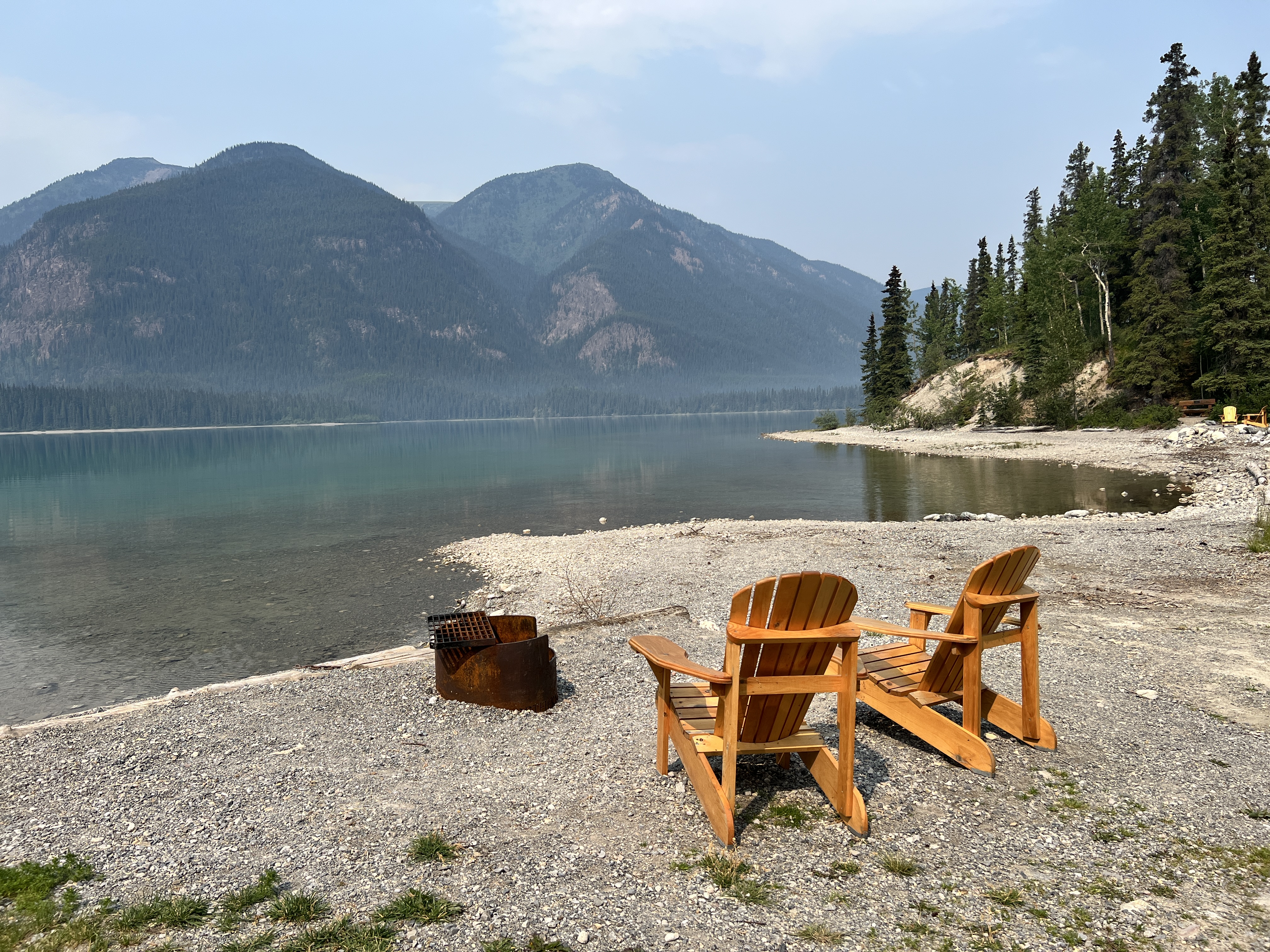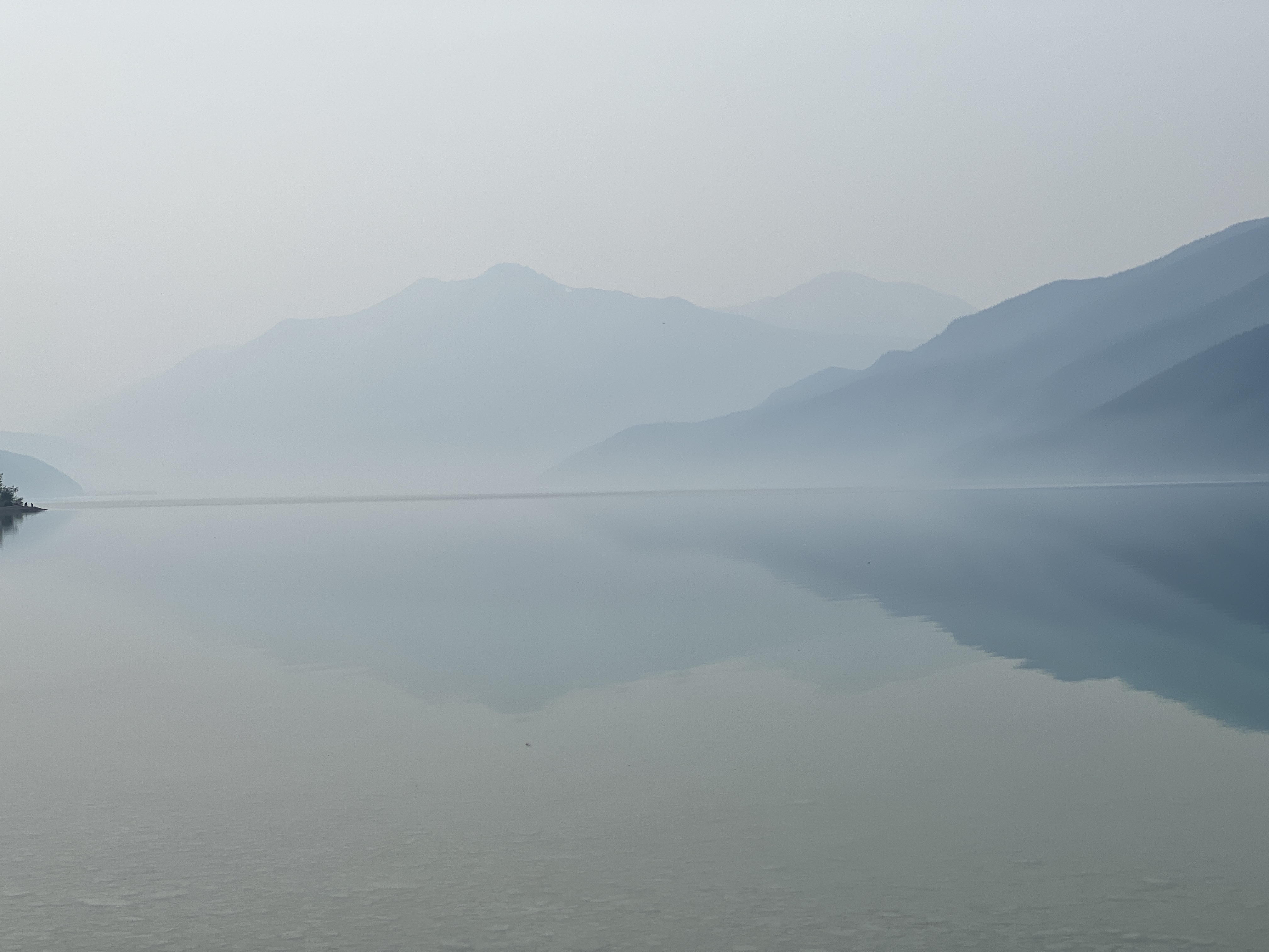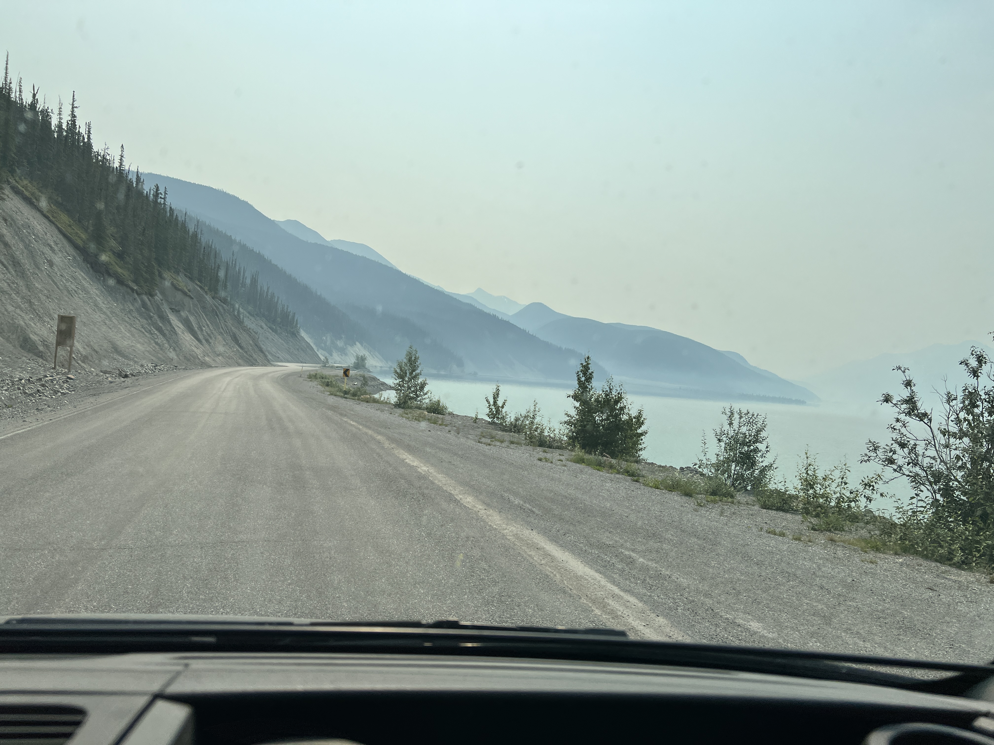 Bereits in Liard Hot Springs wurde die Luft immer schlechter. Auf Nachfrage bei der Rangerin meinte sie, dass sie sich mehr wundern würde, wenn es bei den Temperaturen keine Waldbrände gäbe und sie war recht entspannt. An der nächsten Lodge am Muncholake mit WIFI stellten wir fest, dass die Luftqualität 11 von maximal 11 hat ;-) Die Menschen hier leben damit. Uns lassen die hohen Ozonwerte keine Möglichkeit für Wanderungen.