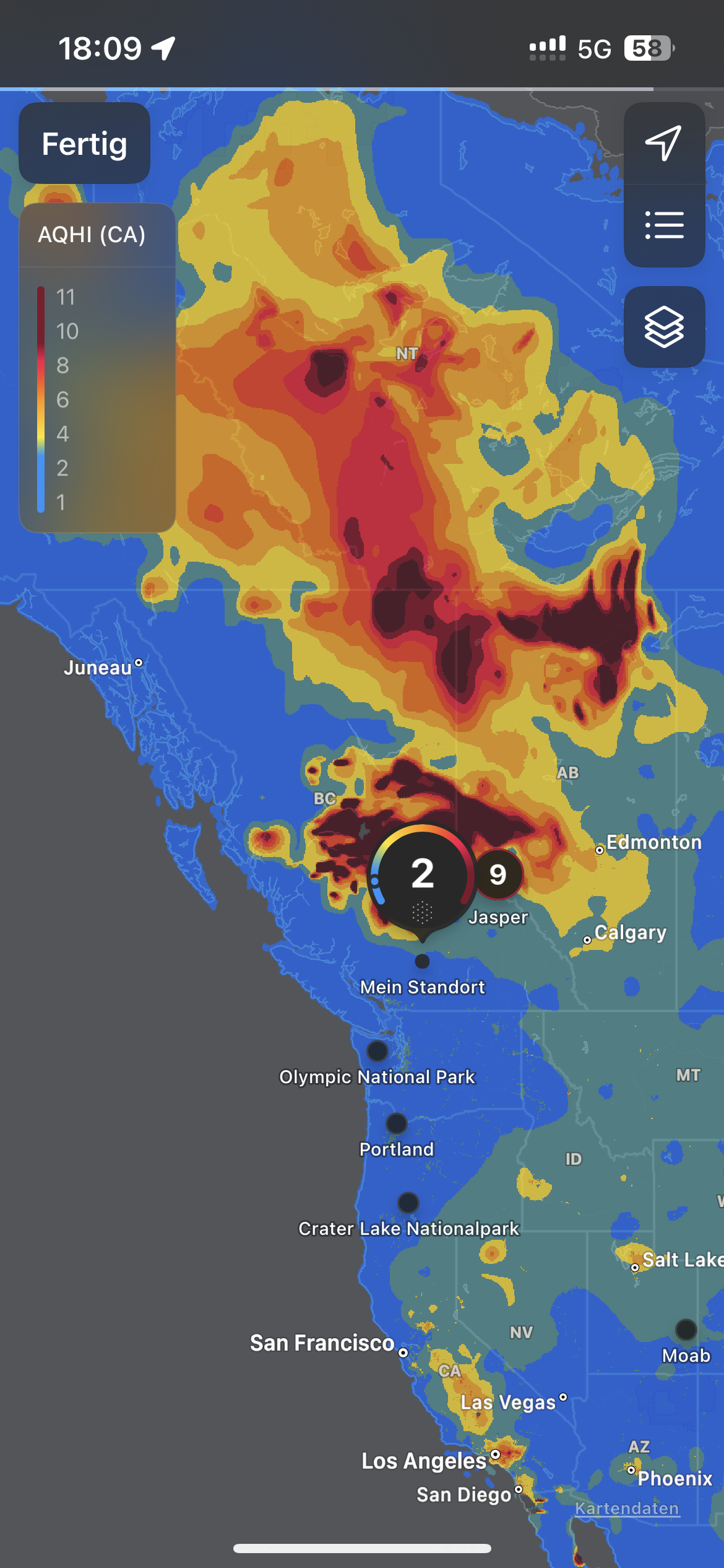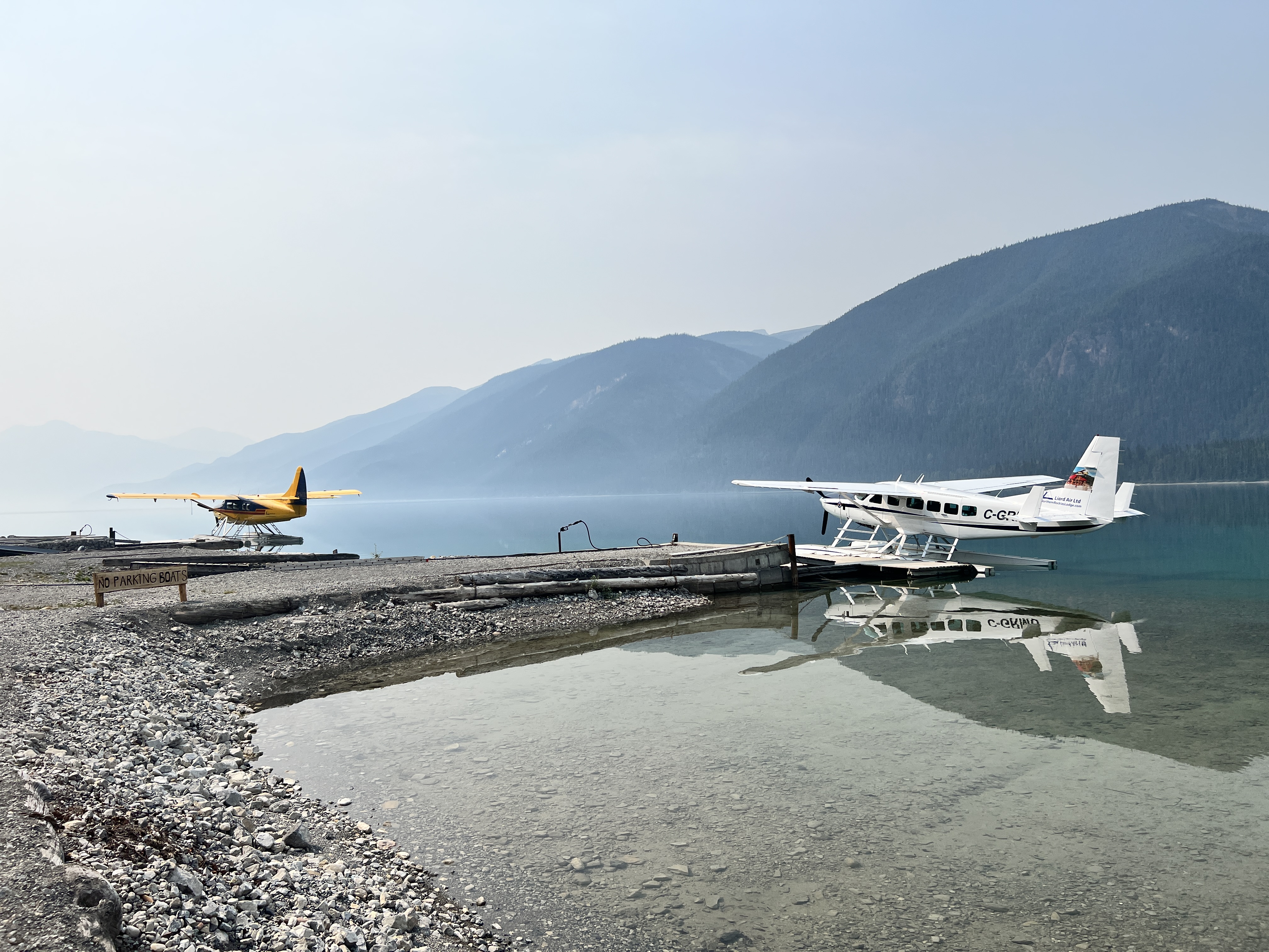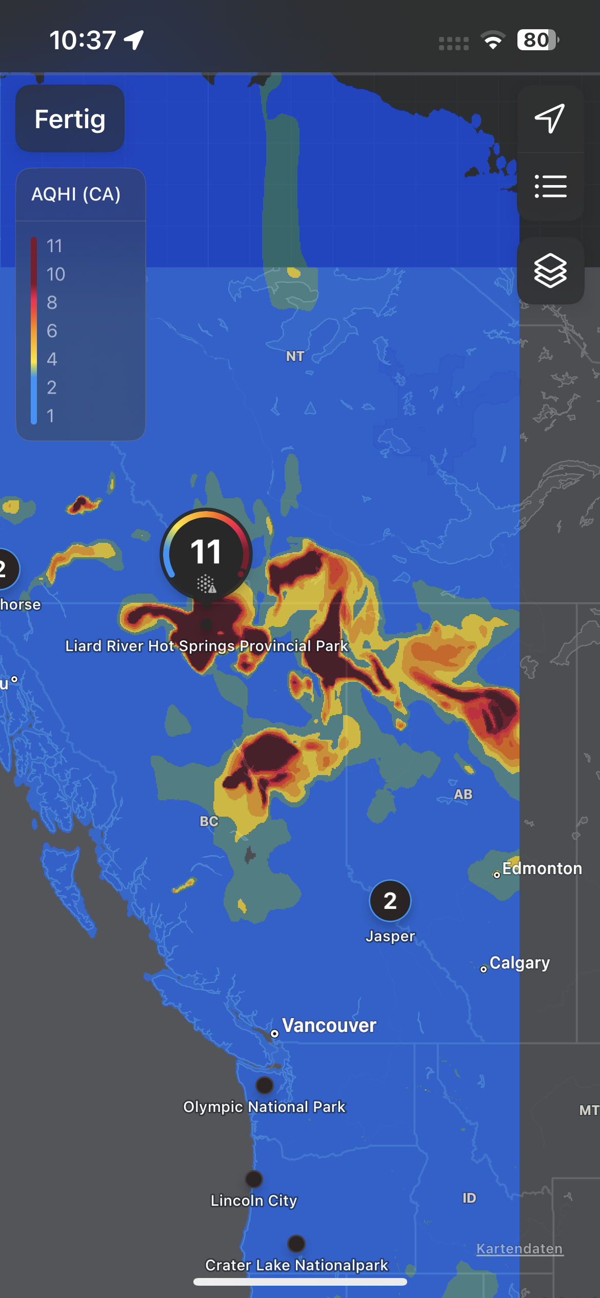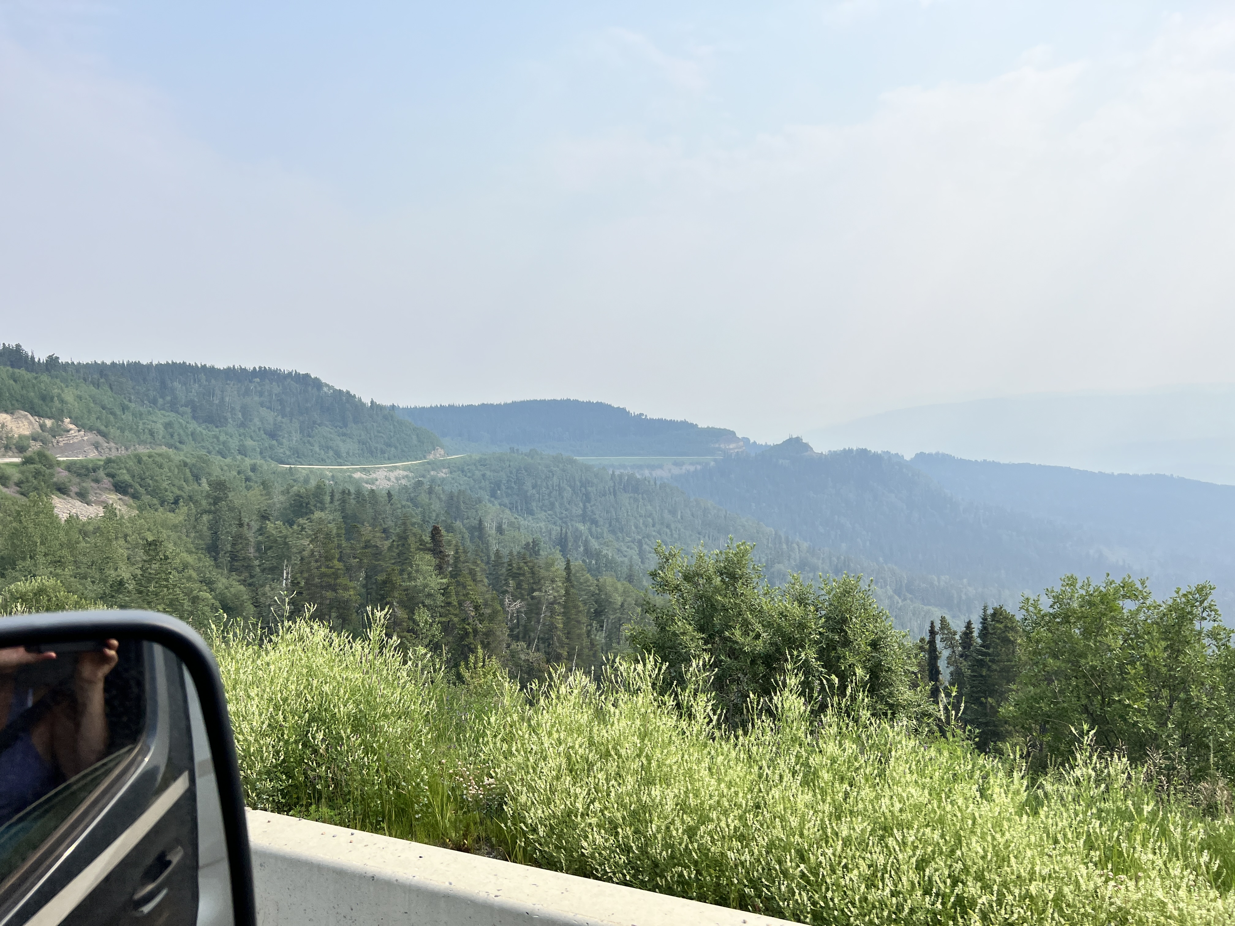 Bereits in Liard Hot Springs wurde die Luft immer schlechter. Auf Nachfrage bei der Rangerin meinte sie, dass sie sich mehr wundern würde, wenn es bei den Temperaturen keine Waldbrände gäbe und sie war recht entspannt. An der nächsten Lodge am Muncholake mit WIFI stellten wir fest, dass die Luftqualität 11 von maximal 11 hat ;-) Die Menschen hier leben damit. Uns lassen die hohen Ozonwerte keine Möglichkeit für Wanderungen.