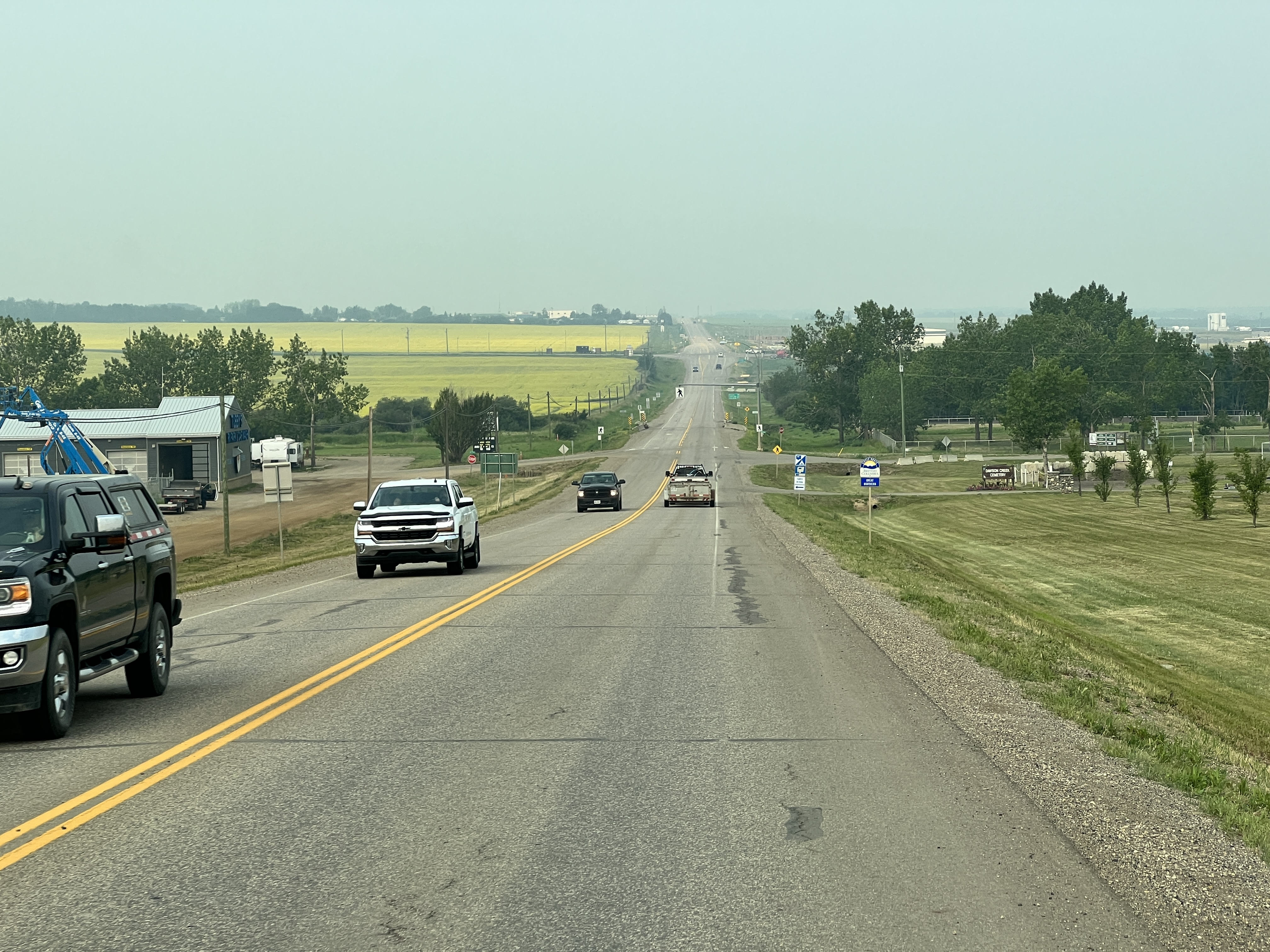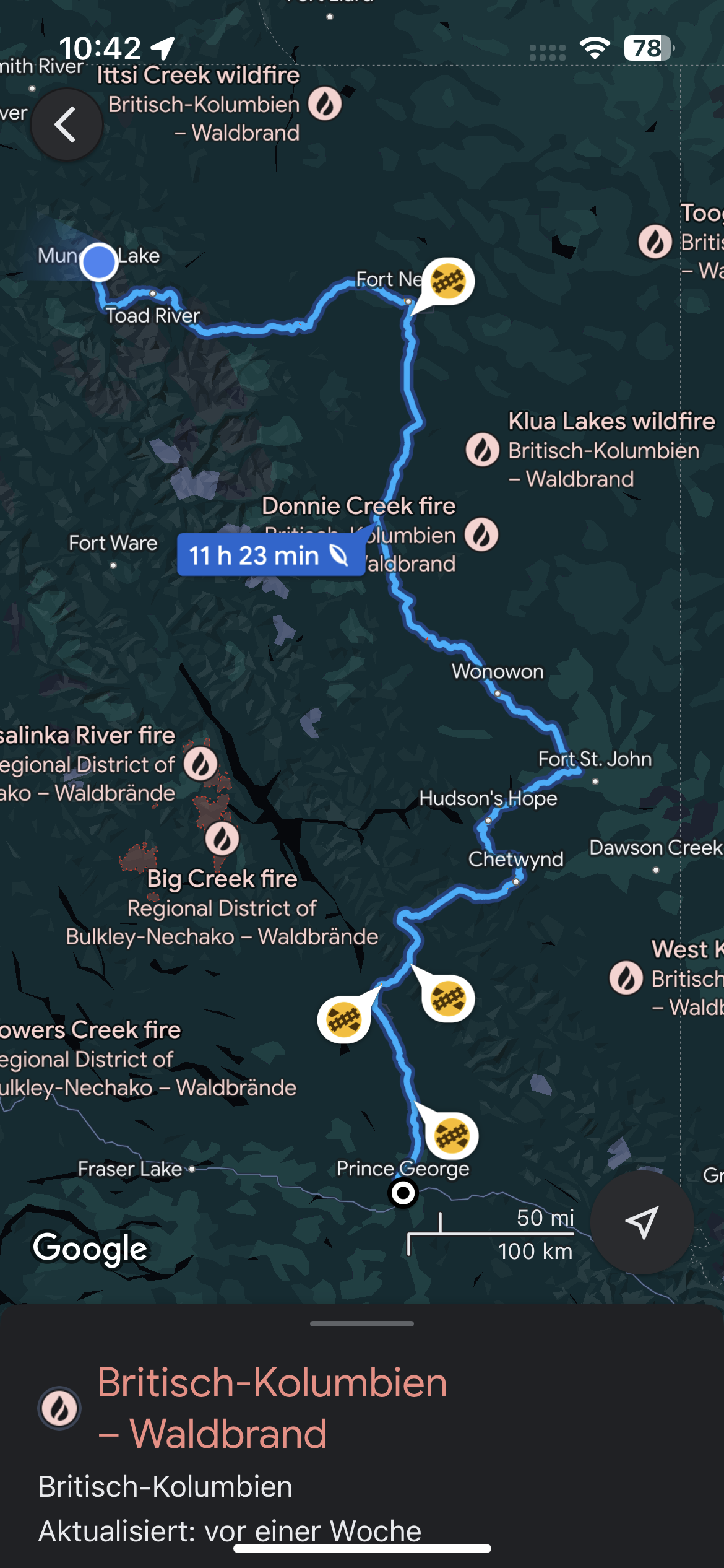 Waldbrände sind seit Jahrtausenden Teil des natürlichen Erneuerungsprozess der Tundra und Waldgebiete und entstehen sehr häufig durch Blitzeinschläge. Viele Brände sind weit entfernt von Wegen und Siedlungen und werden nur beobachtet. Die Trockenheit und die ungewöhnlich hohen Temperaturen machen die Vielzahl und Flächen der Brände problematisch. Wir mussten ca. 1.600 km durchqueren, um aus dem Smoke herauszukommen. Die Schadstoffe in der Luft (bis hin zu Asche) sind teilweise extrem hoch. Feuer haben wir bisher nur einmal gesehen.