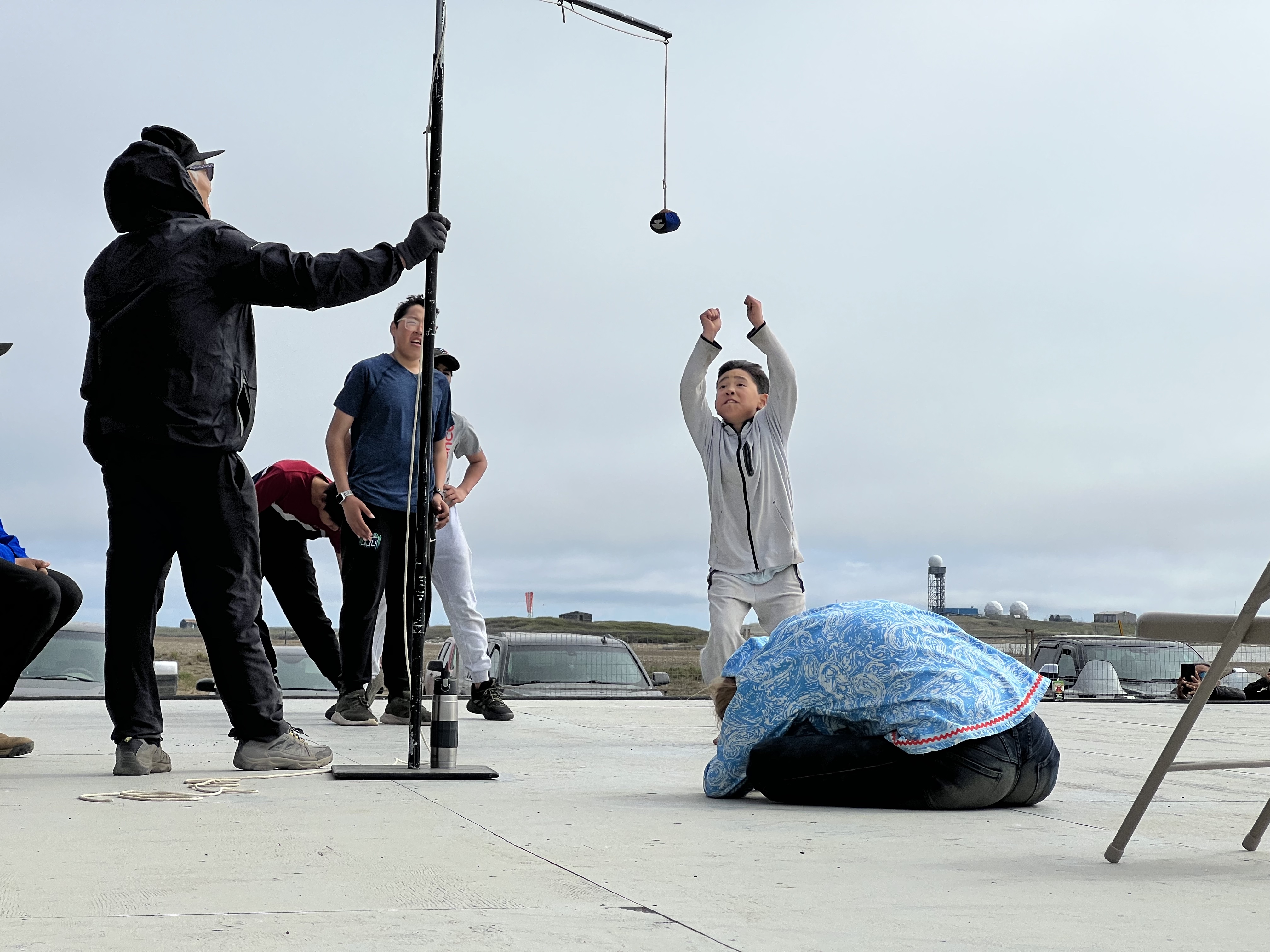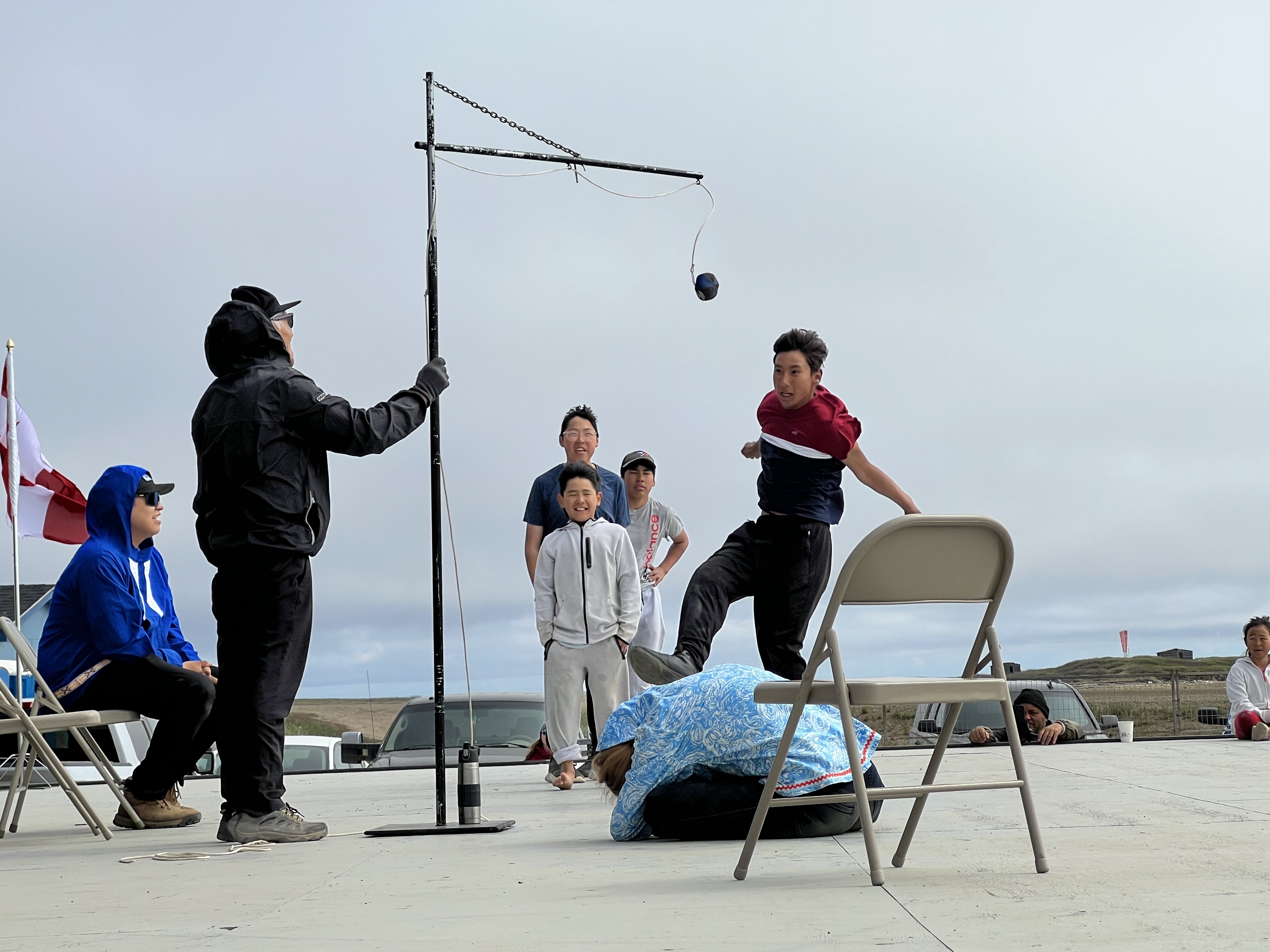 Es gibt viele Wettkämpfe. Zuerst muss ein Stein, der immer höher gehängt wird mit einem Fuss erreicht werden.