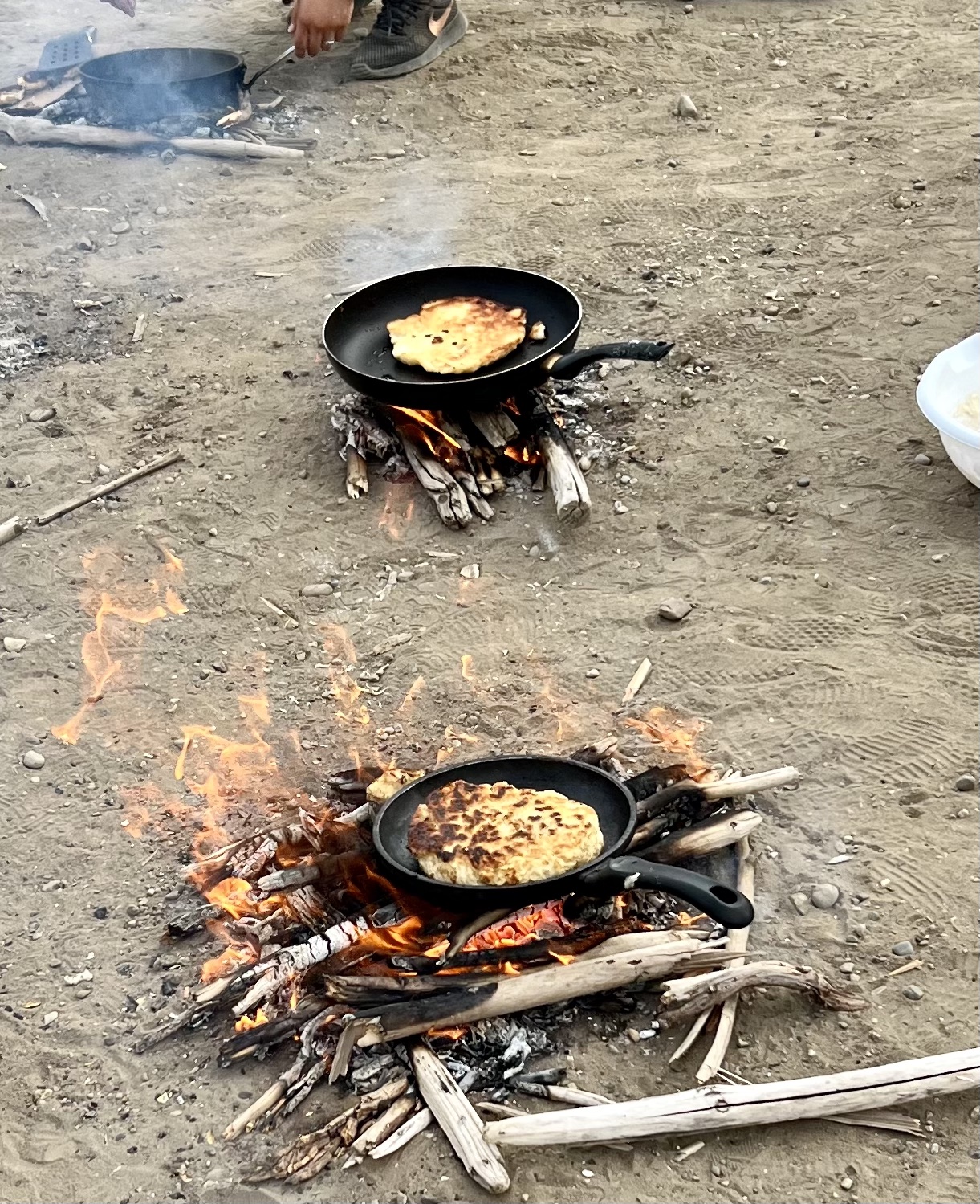 Es wird Bannock - eine Art Pfannkuchen - gebraten, und nach Schnelligkeit und Geschmack bewertet.