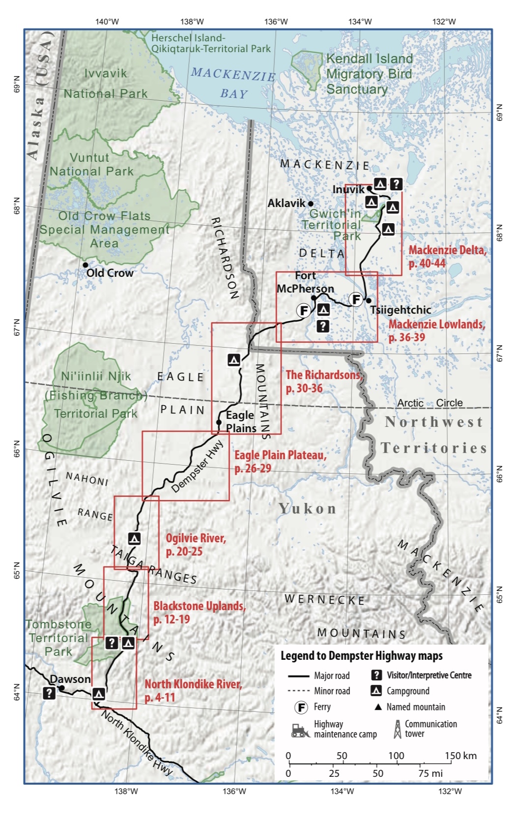 Hier ein Überblick über den Dempster Highway (ohne die Piste nach Tuktoyaktuk). Hin und zurück sind es 1750 km Schotterpiste: