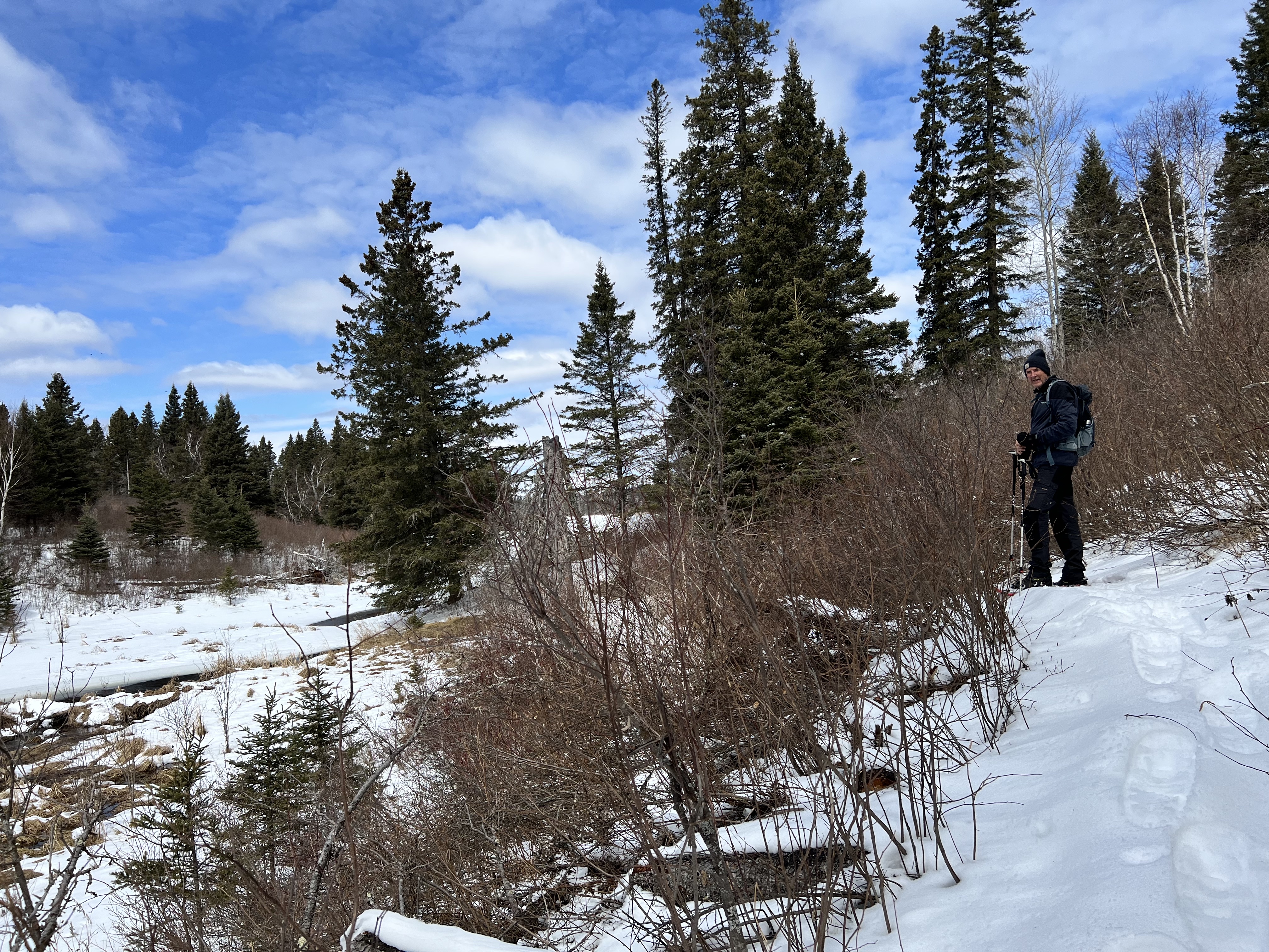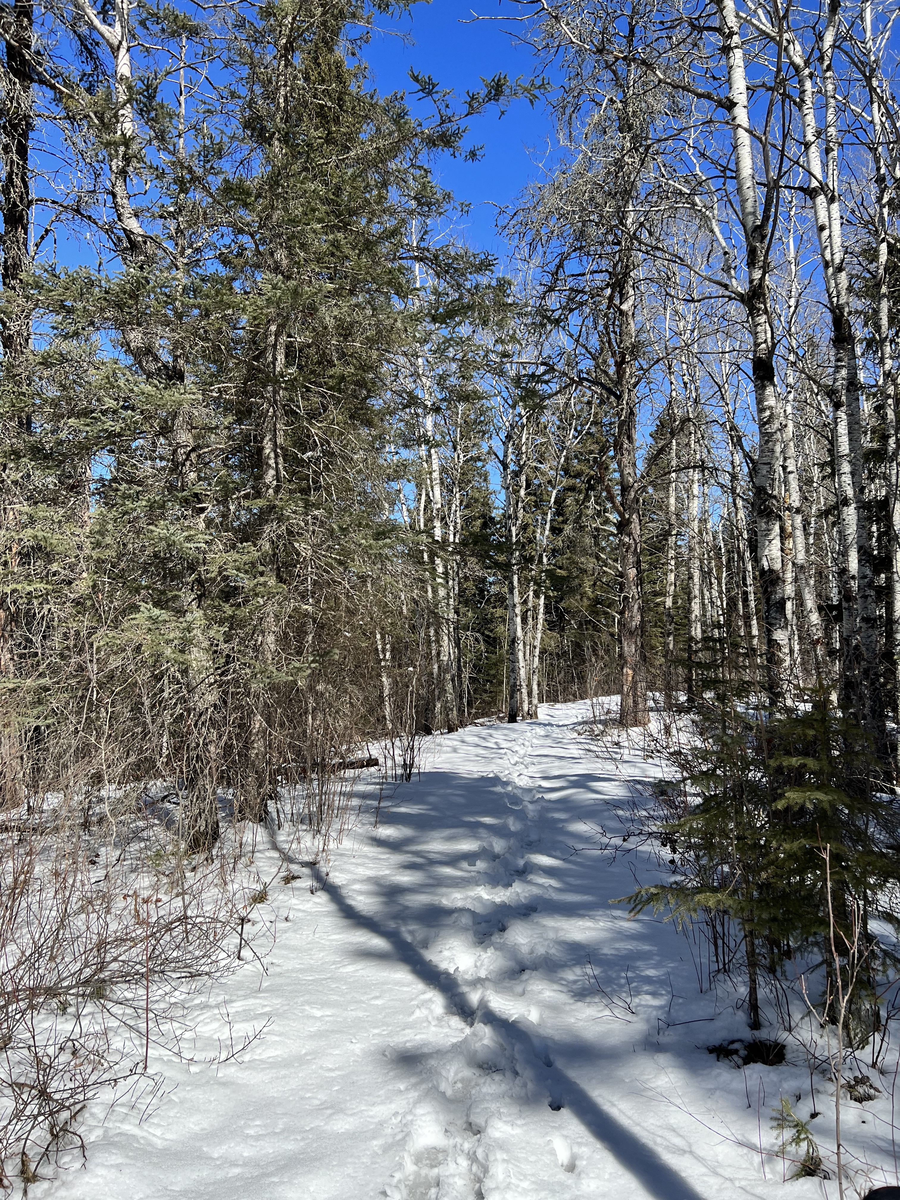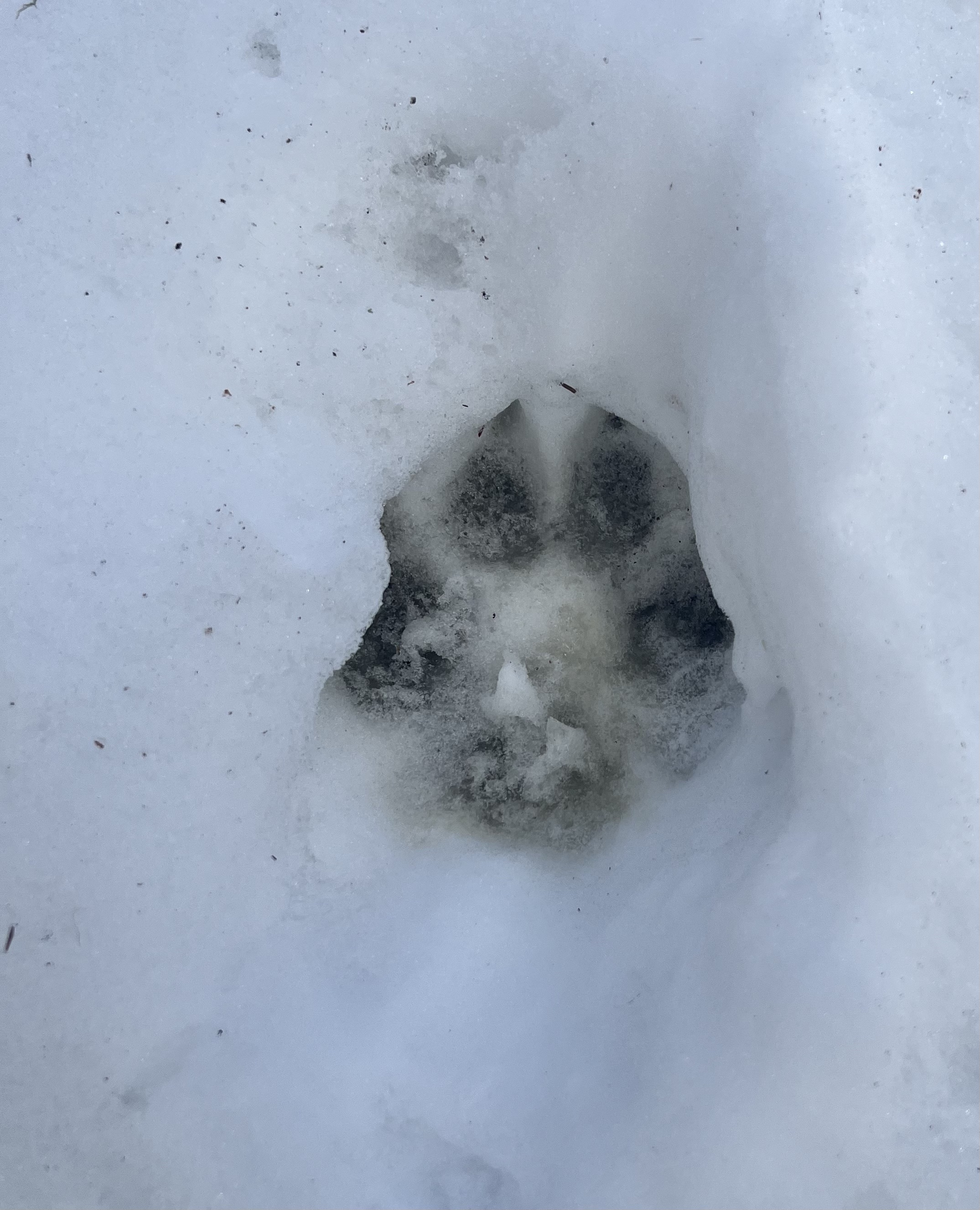 Dort wandern wir den Bead Lake Trail. Die Schneeschuhe und Bear Bells kommen zum Einsatz, wir gehen in unberührte Natur und checken über Maps out, dass wir auf dem Trail sind. Und vor uns war doch schon einer unterwegs: unsere Fährtenrecherche deuten auf einen Wolf oder Kojoten hin, die auch hier leben sollen.