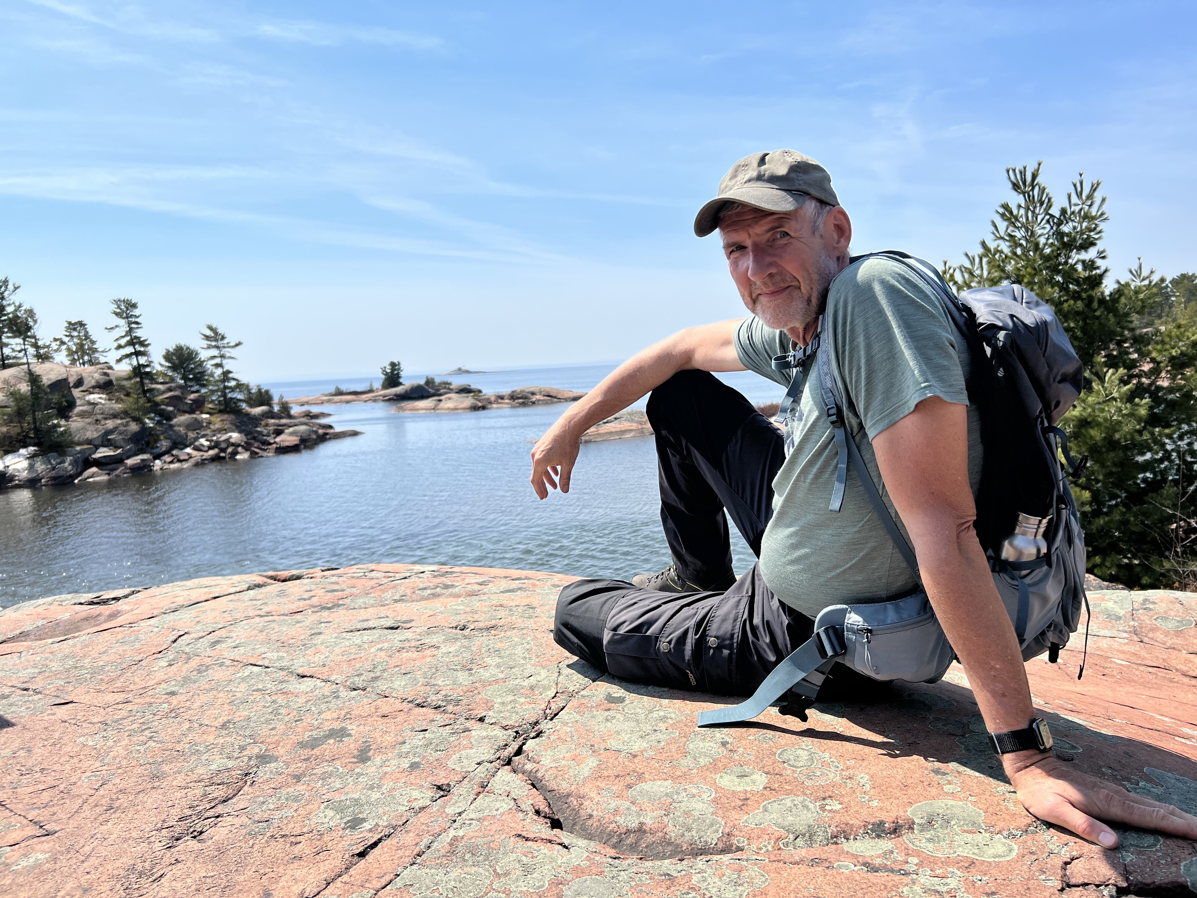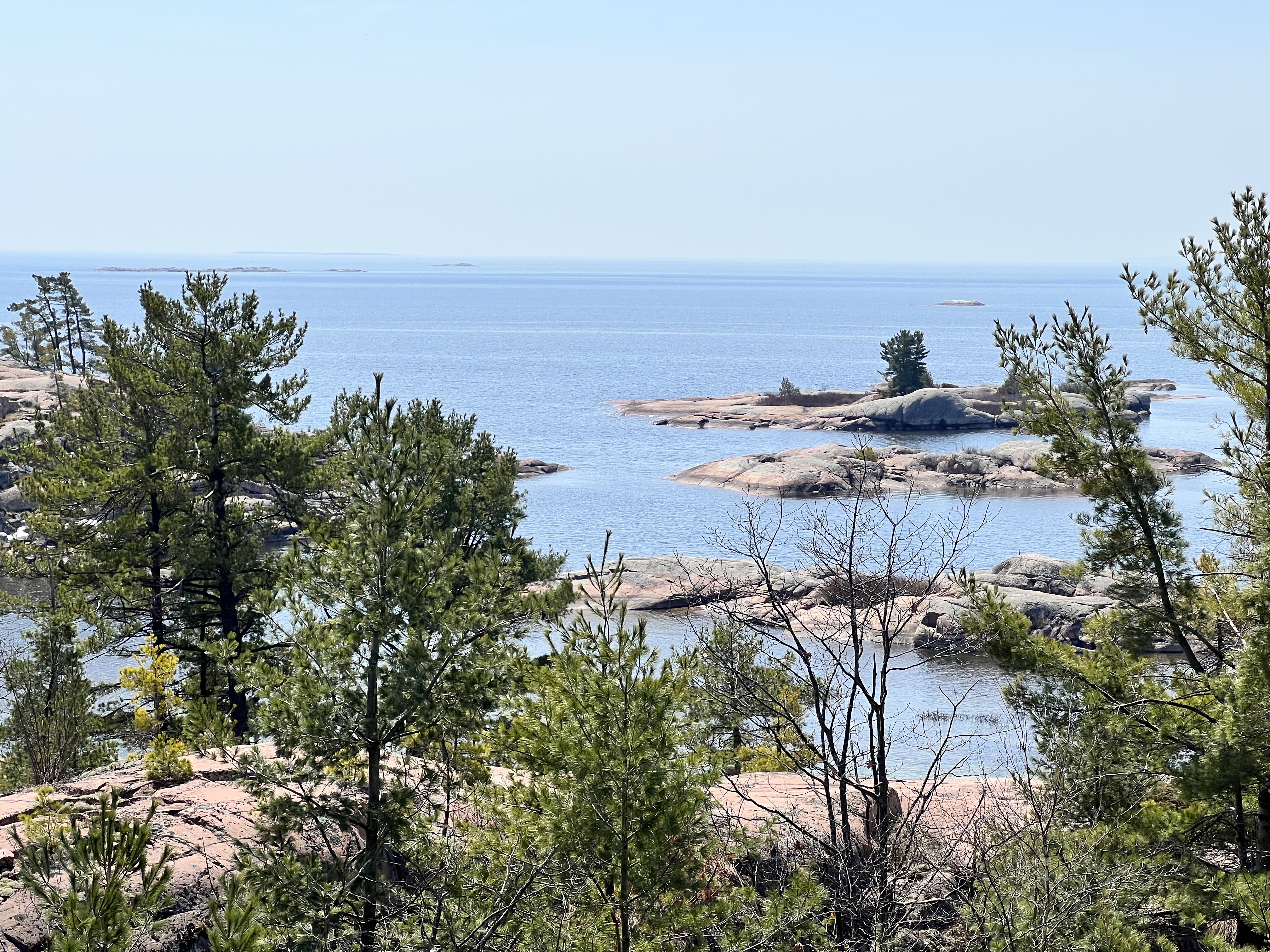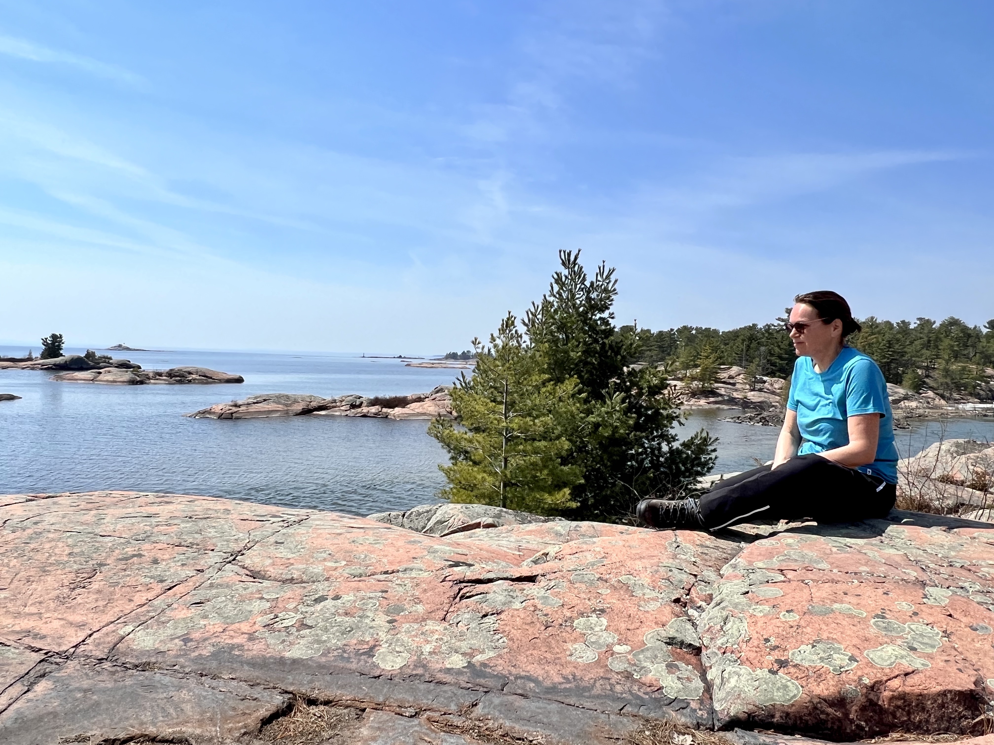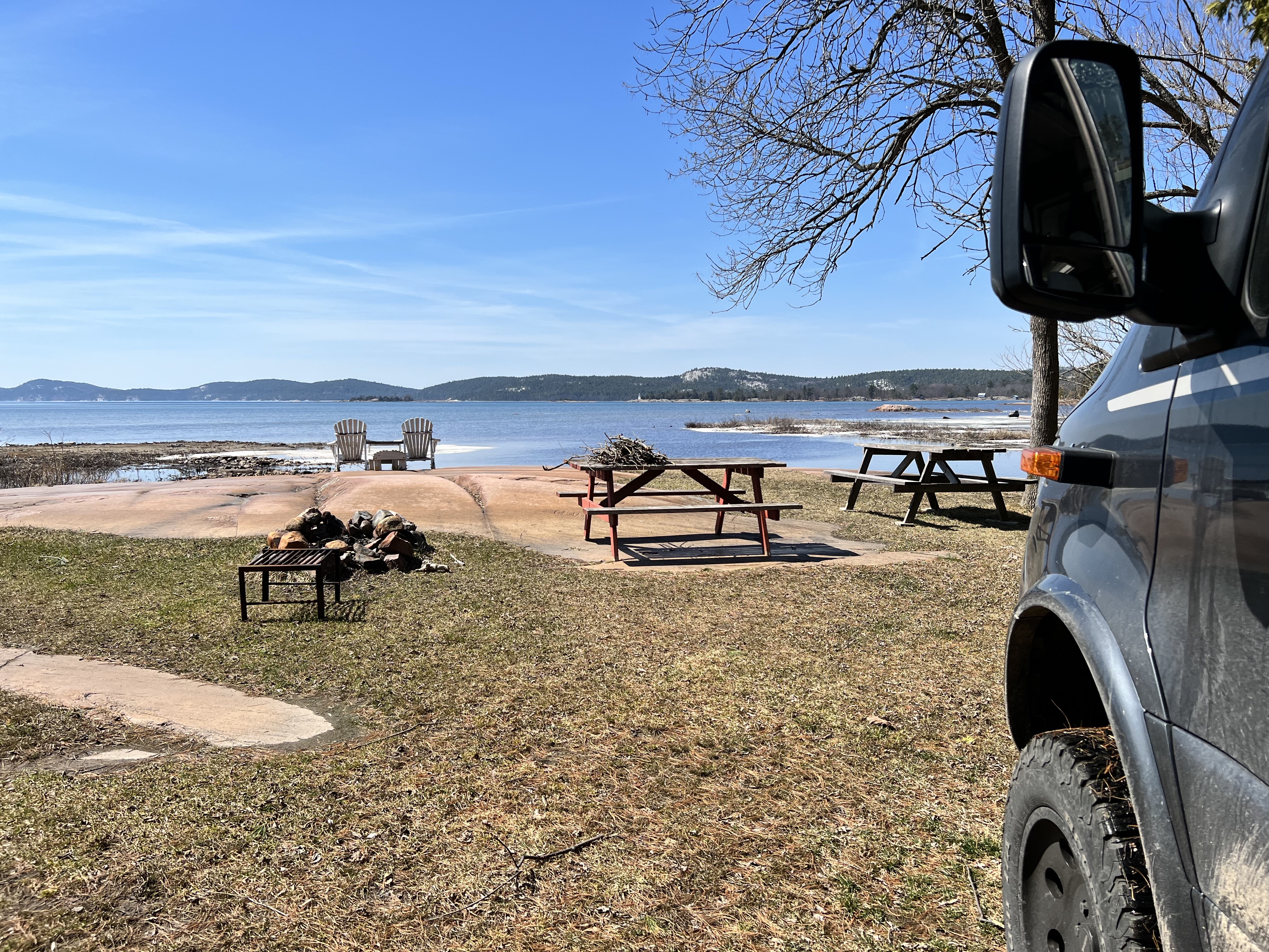 Der Killarney Provincial Park wurde mit Unterstützung der Künstler der Group of Seven geschaffen und von den Landschaftsmotive für Ihre Bilder stammen viele aus dem Park. Der Ort hieß bei den First Nation „sichere Kanu-Durchfahrt“ und war ein wichtiger Umschlagplatz als der Transport von Pelzen und Holz über Flüsse und Seen ging. Der Park sollte geöffnet sein, Campsite war keine zu reservieren; wir hofften, am Park Gate stehen zu dürfen. Als wir ankamen, wurde uns alternativ eine private Campsite genannt und wir standen alleine auf roten Felsen mit Blick auf die Georgian Bay bei traumhaften Sonnenschein! (Camping Rocher Rouge, Platz 7) Wir genossen den Nachmittag dort, verlängerten um eine Nacht und besorgten uns noch Grillfleisch im General Store.