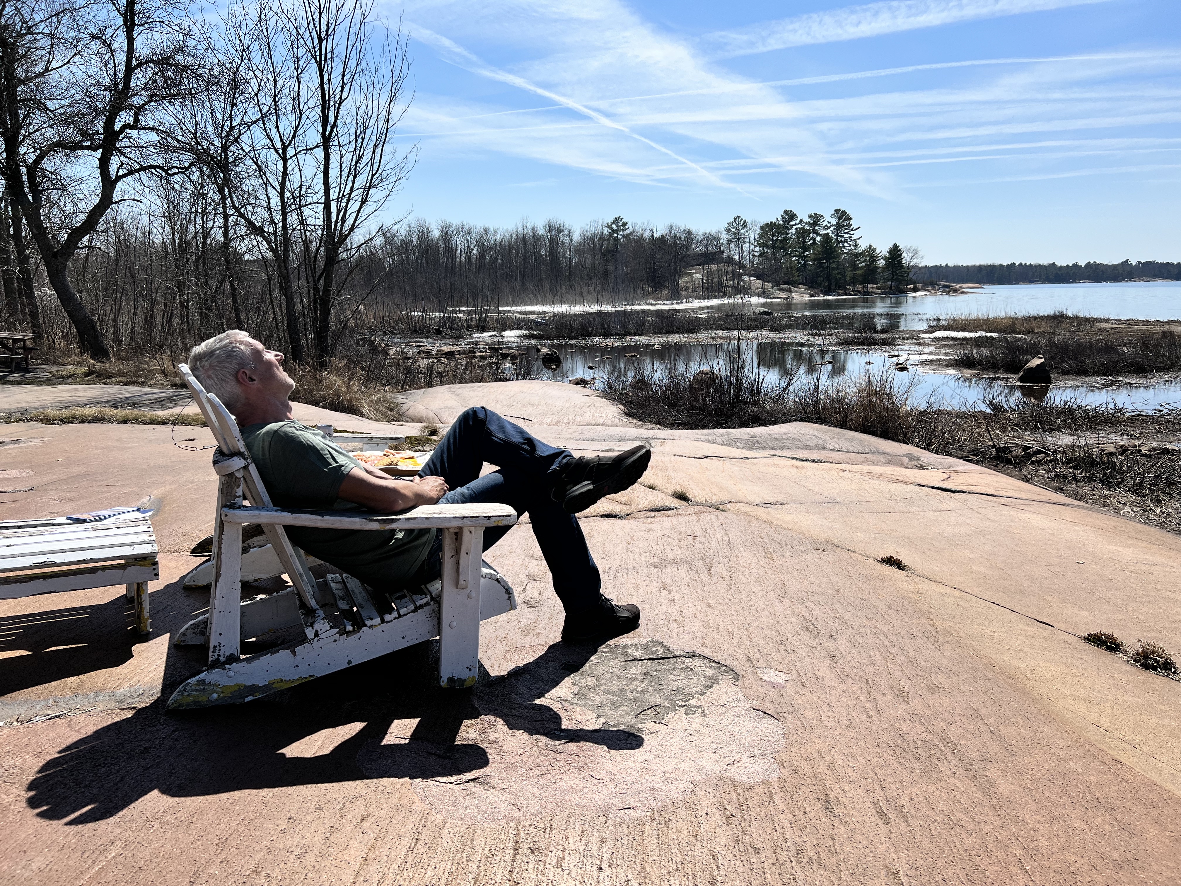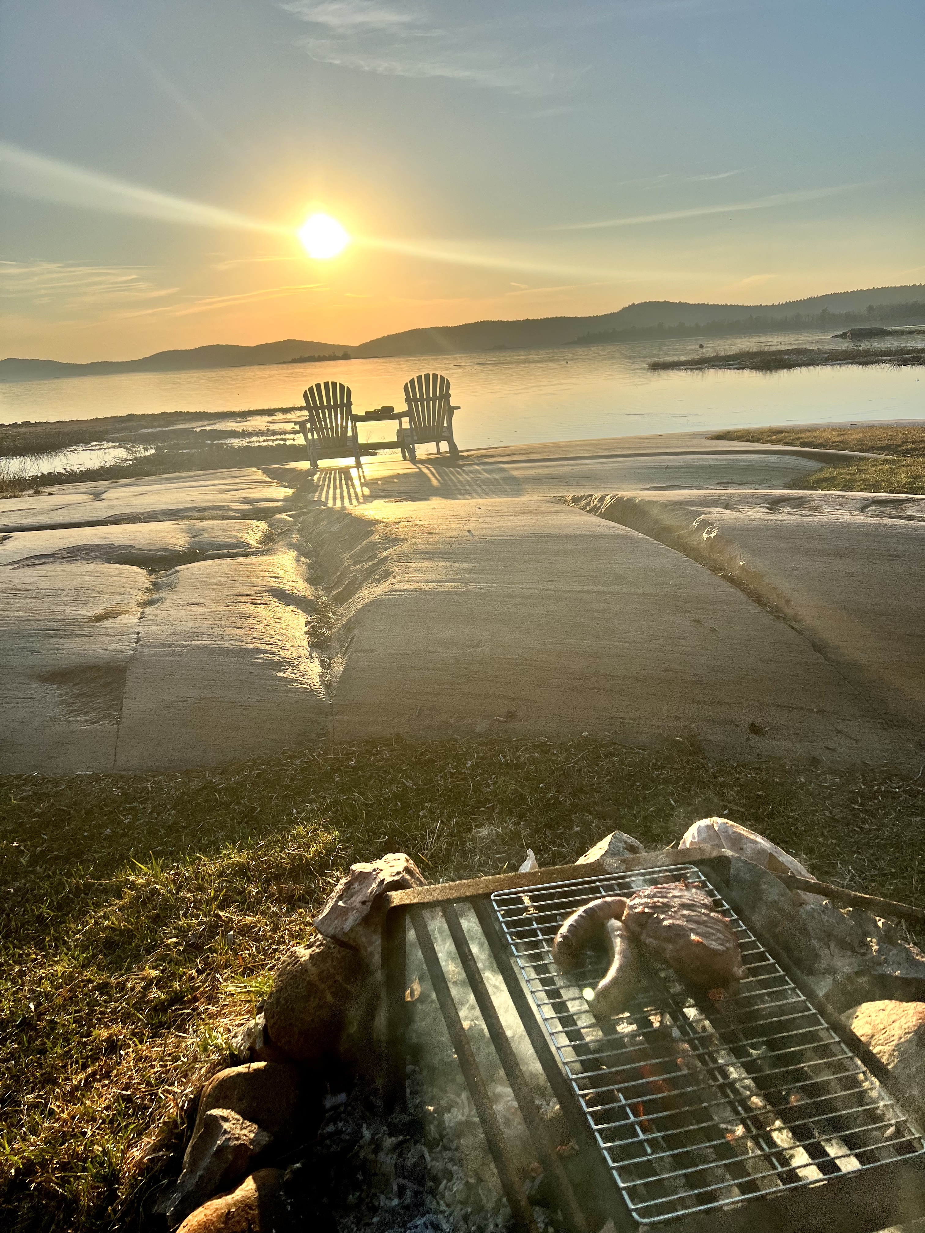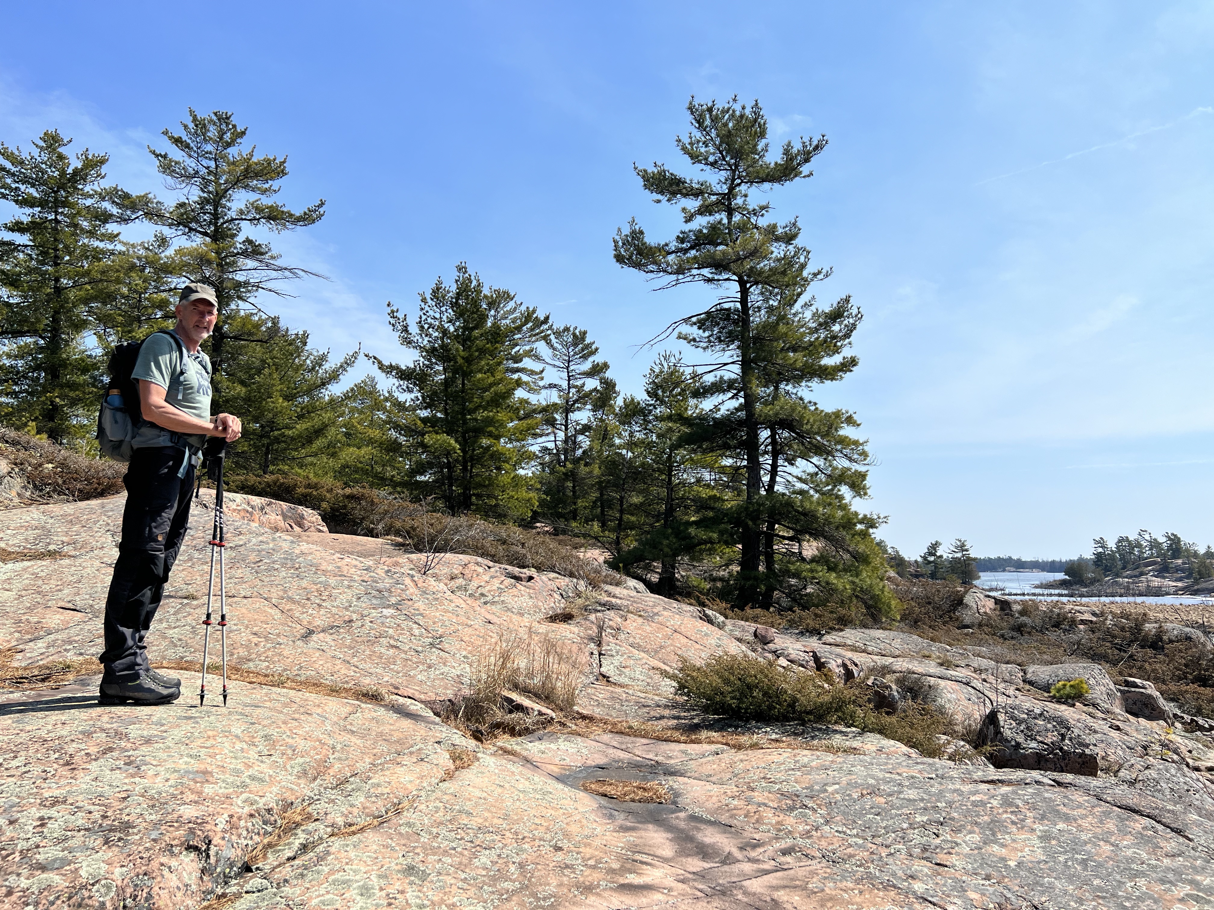 Der Killarney Provincial Park wurde mit Unterstützung der Künstler der Group of Seven geschaffen und von den Landschaftsmotive für Ihre Bilder stammen viele aus dem Park. Der Ort hieß bei den First Nation „sichere Kanu-Durchfahrt“ und war ein wichtiger Umschlagplatz als der Transport von Pelzen und Holz über Flüsse und Seen ging. Der Park sollte geöffnet sein, Campsite war keine zu reservieren; wir hofften, am Park Gate stehen zu dürfen. Als wir ankamen, wurde uns alternativ eine private Campsite genannt und wir standen alleine auf roten Felsen mit Blick auf die Georgian Bay bei traumhaften Sonnenschein! (Camping Rocher Rouge, Platz 7) Wir genossen den Nachmittag dort, verlängerten um eine Nacht und besorgten uns noch Grillfleisch im General Store.