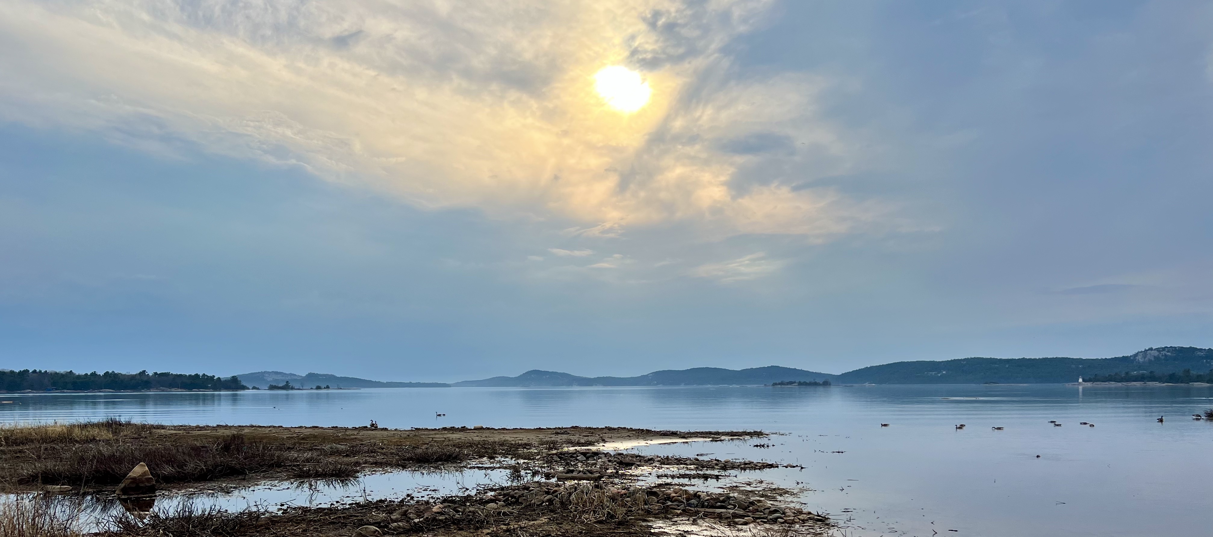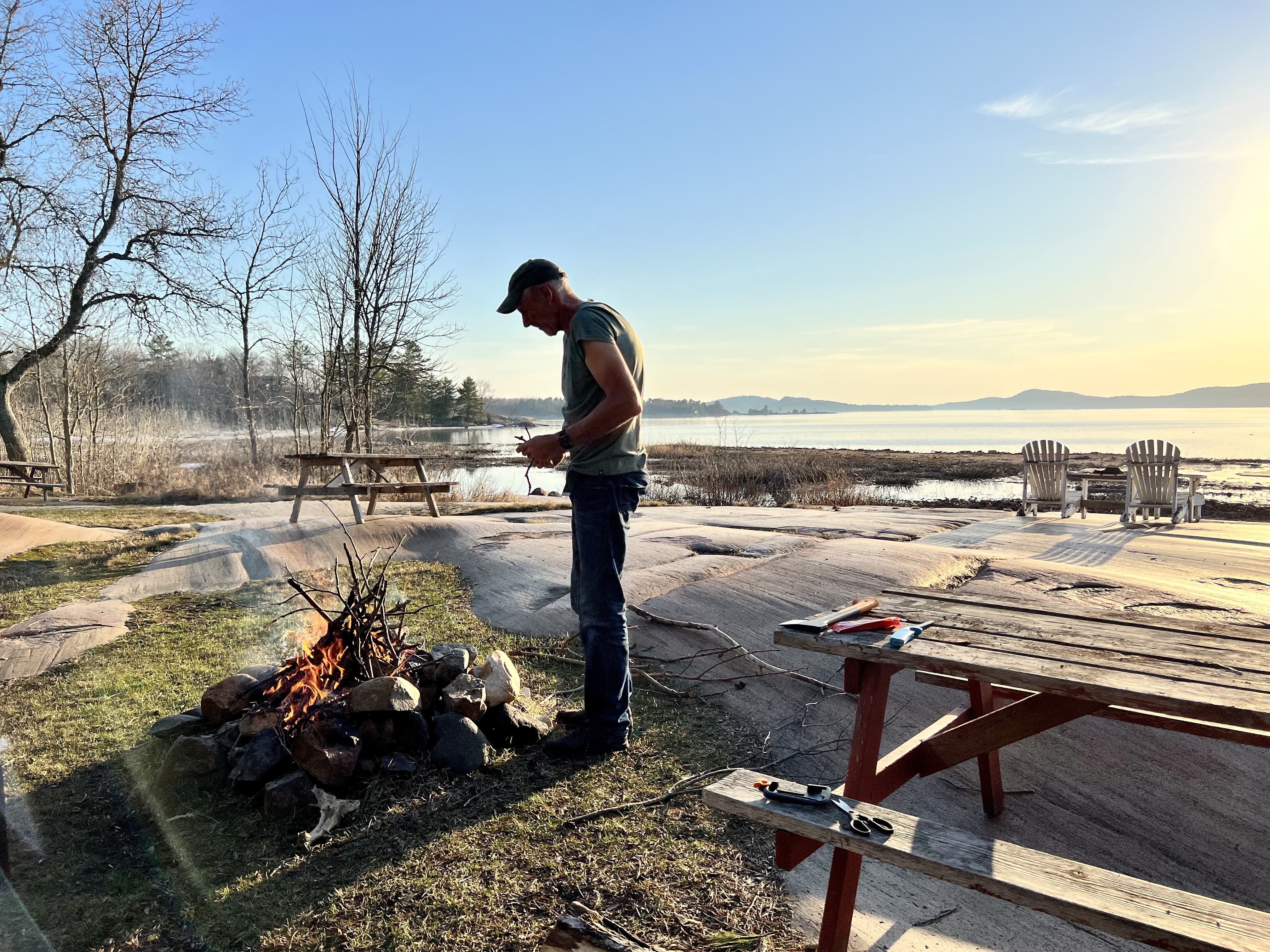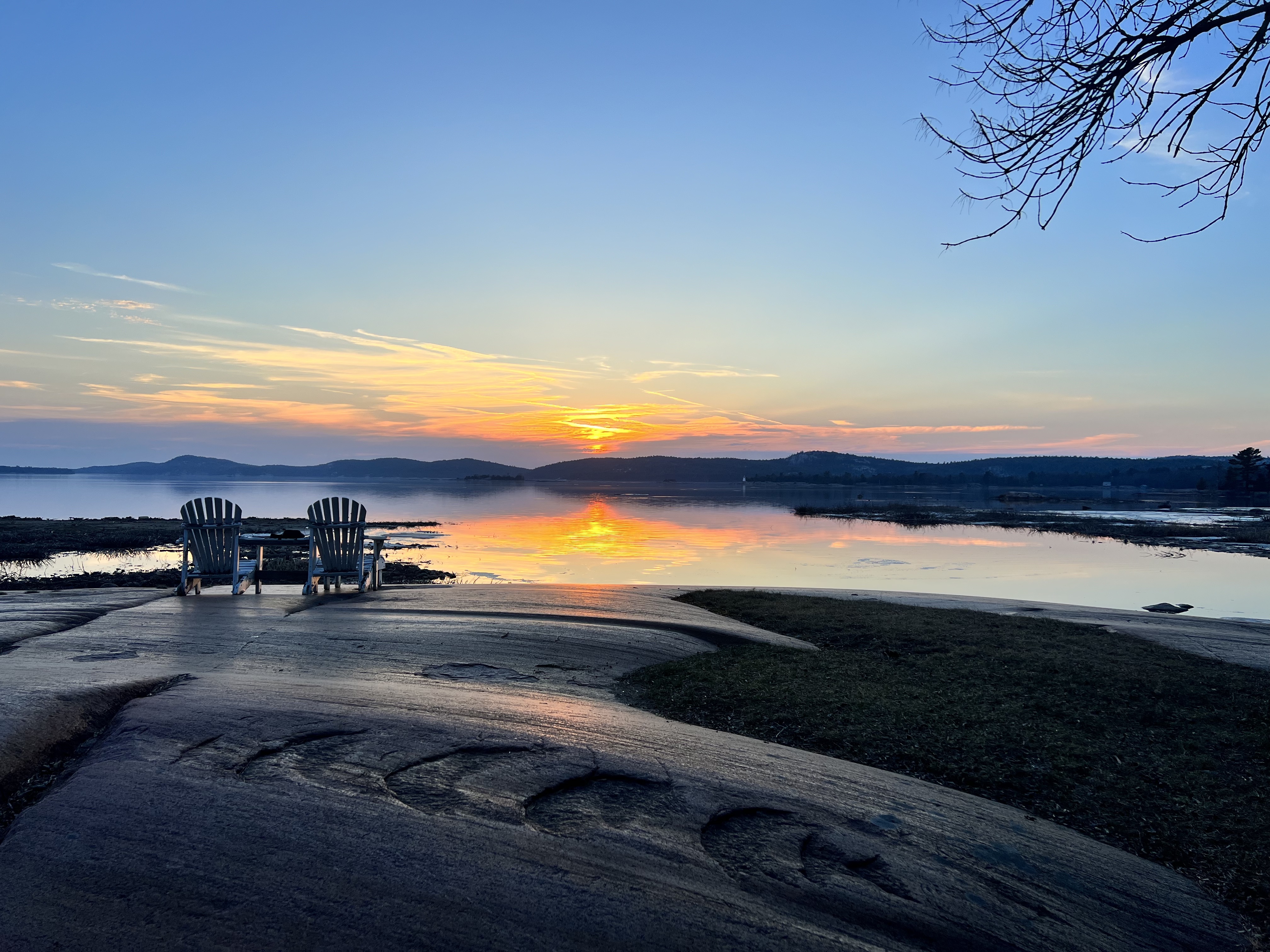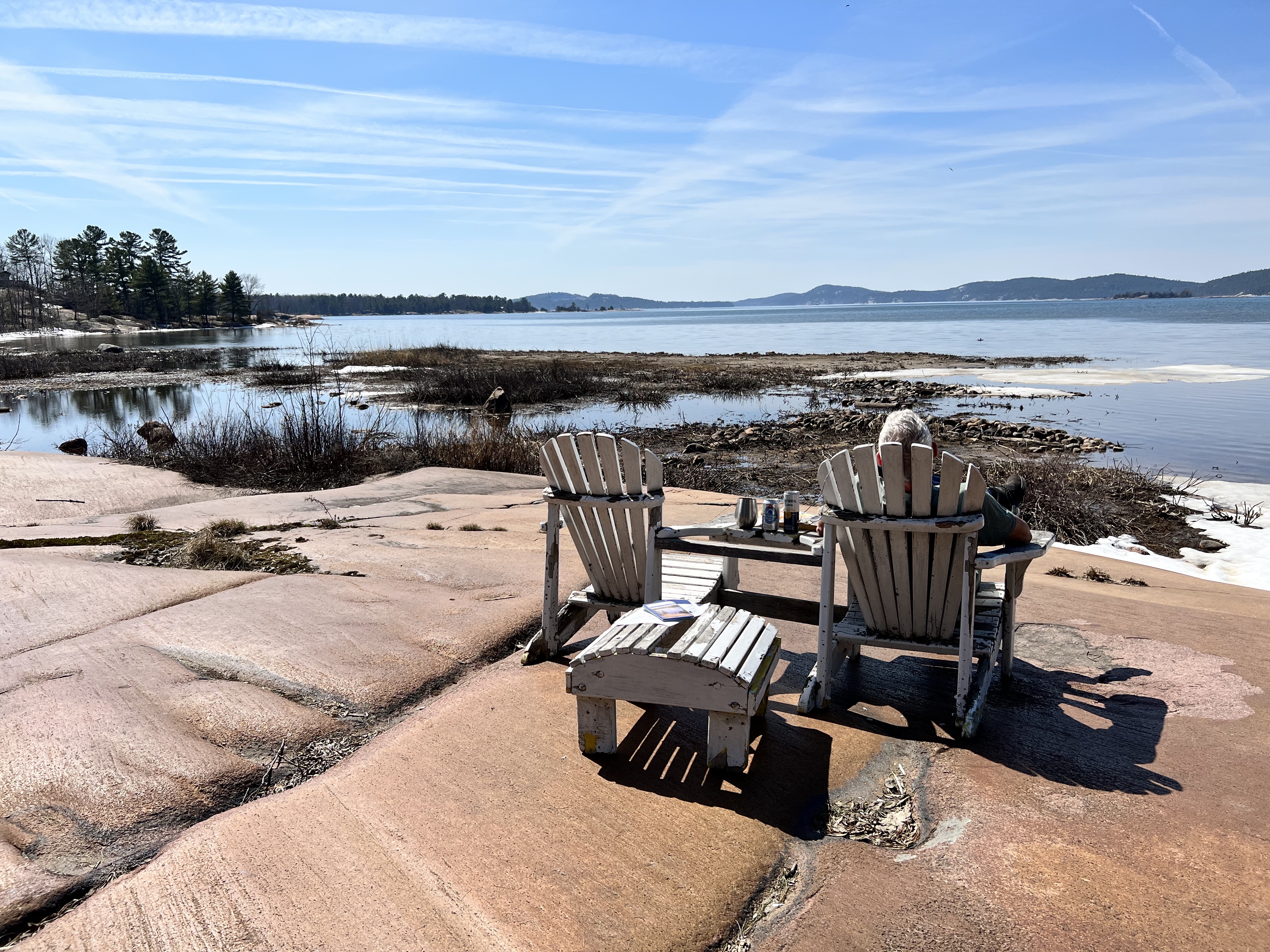 Der Killarney Provincial Park wurde mit Unterstützung der Künstler der Group of Seven geschaffen und von den Landschaftsmotive für Ihre Bilder stammen viele aus dem Park. Der Ort hieß bei den First Nation „sichere Kanu-Durchfahrt“ und war ein wichtiger Umschlagplatz als der Transport von Pelzen und Holz über Flüsse und Seen ging. Der Park sollte geöffnet sein, Campsite war keine zu reservieren; wir hofften, am Park Gate stehen zu dürfen. Als wir ankamen, wurde uns alternativ eine private Campsite genannt und wir standen alleine auf roten Felsen mit Blick auf die Georgian Bay bei traumhaften Sonnenschein! (Camping Rocher Rouge, Platz 7) Wir genossen den Nachmittag dort, verlängerten um eine Nacht und besorgten uns noch Grillfleisch im General Store.