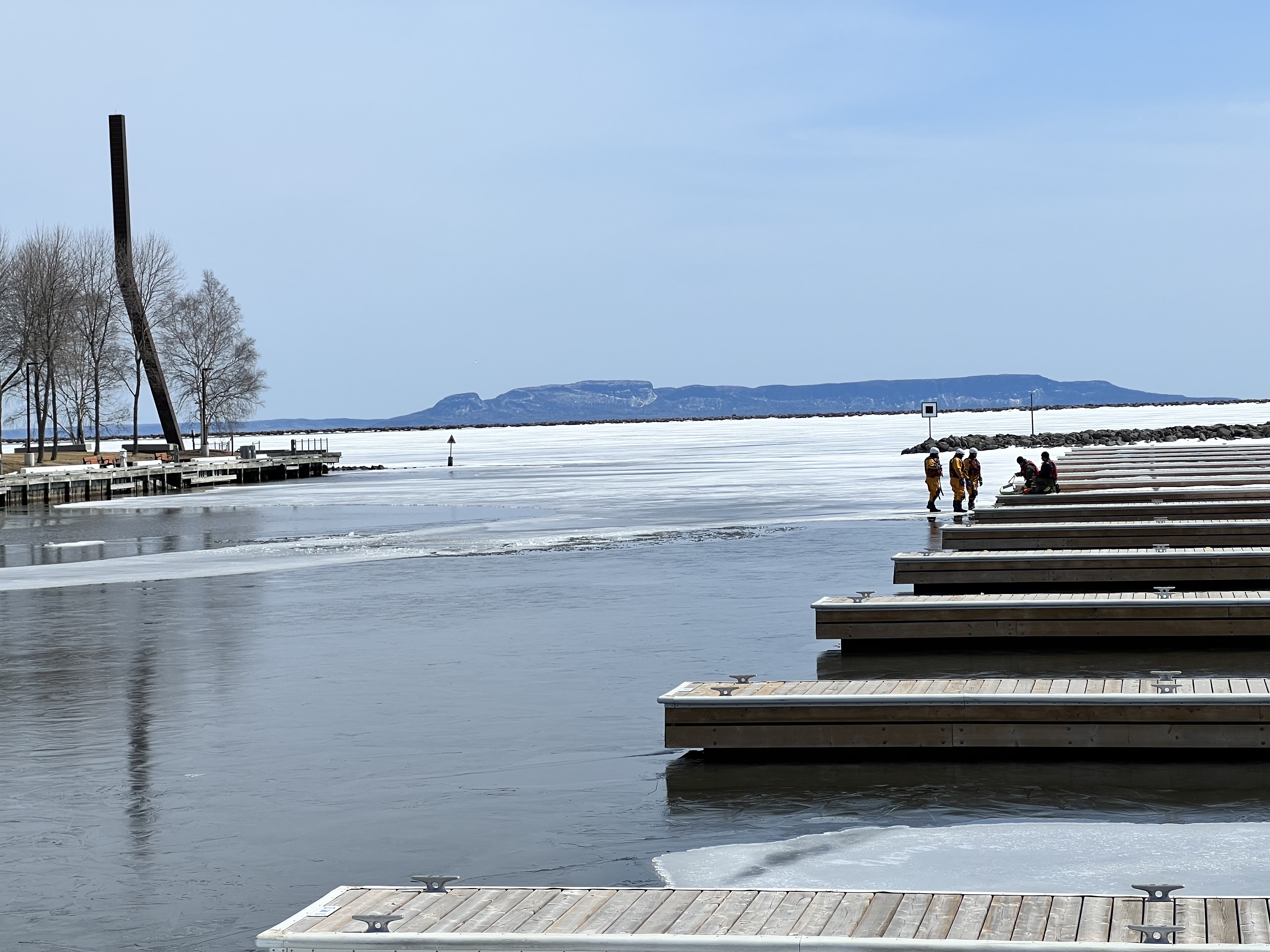 Thunder Bay stehen wir in der Nähe der Marina. Der Spaziergang an der Marina war sehr schön; die Thunder Bay Feuerwehr probte eine Eisrettung.
